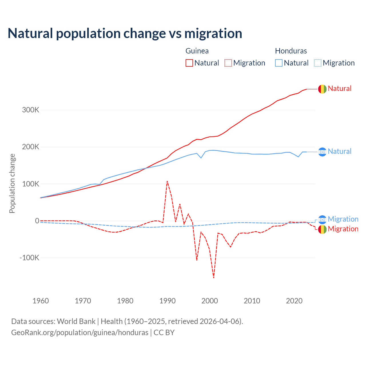 Over the last 10 years, 97.2% of the population change in Guinea is from natural causes (a gain of 3,346,936 people) and 2.76% is from migration (a loss of 94,924 people). In Honduras 96.7% is from natural causes (a gain of 1,821,125 people) and 3.29% is from migration (a loss of 61,965 people).