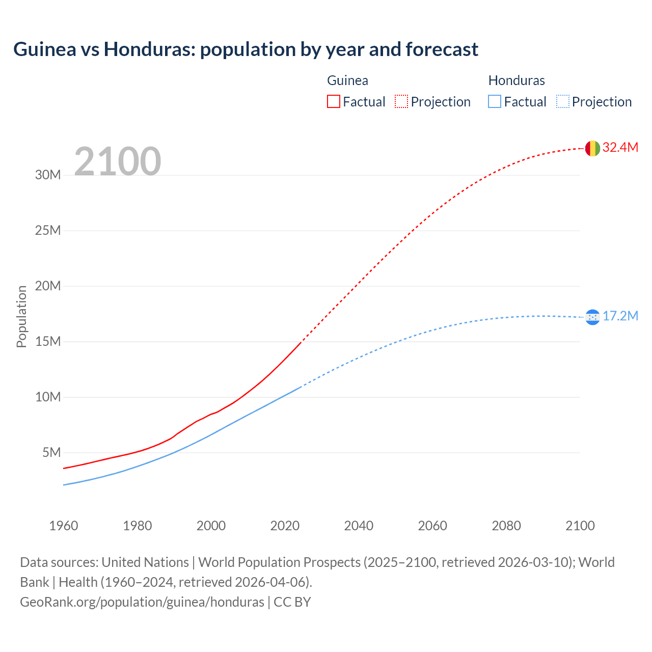 The latest officially reported population of Guinea was 14,754,785 in 2024 vs 10,825,703 people in Honduras in 2024. In 2026, based on the adjusted UN estimation, the current Guinea's population is 15,546,235 people compared to 11,237,619 in Honduras.