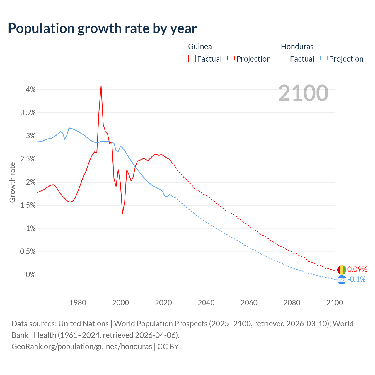- For the last 10 years, Guinea has had an average growth rate of +2.54% per year vs +1.81% in Honduras.