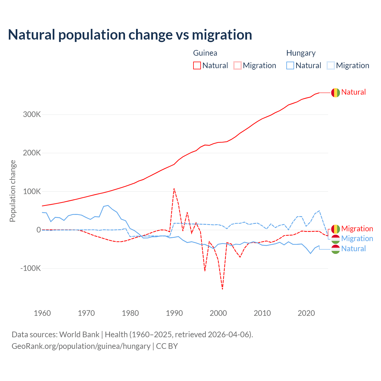 Over the last 10 years, 97.2% of the population change in Guinea is from natural causes (a gain of 3,346,936 people) and 2.76% is from migration (a loss of 94,924 people). In Hungary 63.7% is from natural causes (a loss of 412,838 people) and 36.3% is from migration (a gain of 234,837 people).