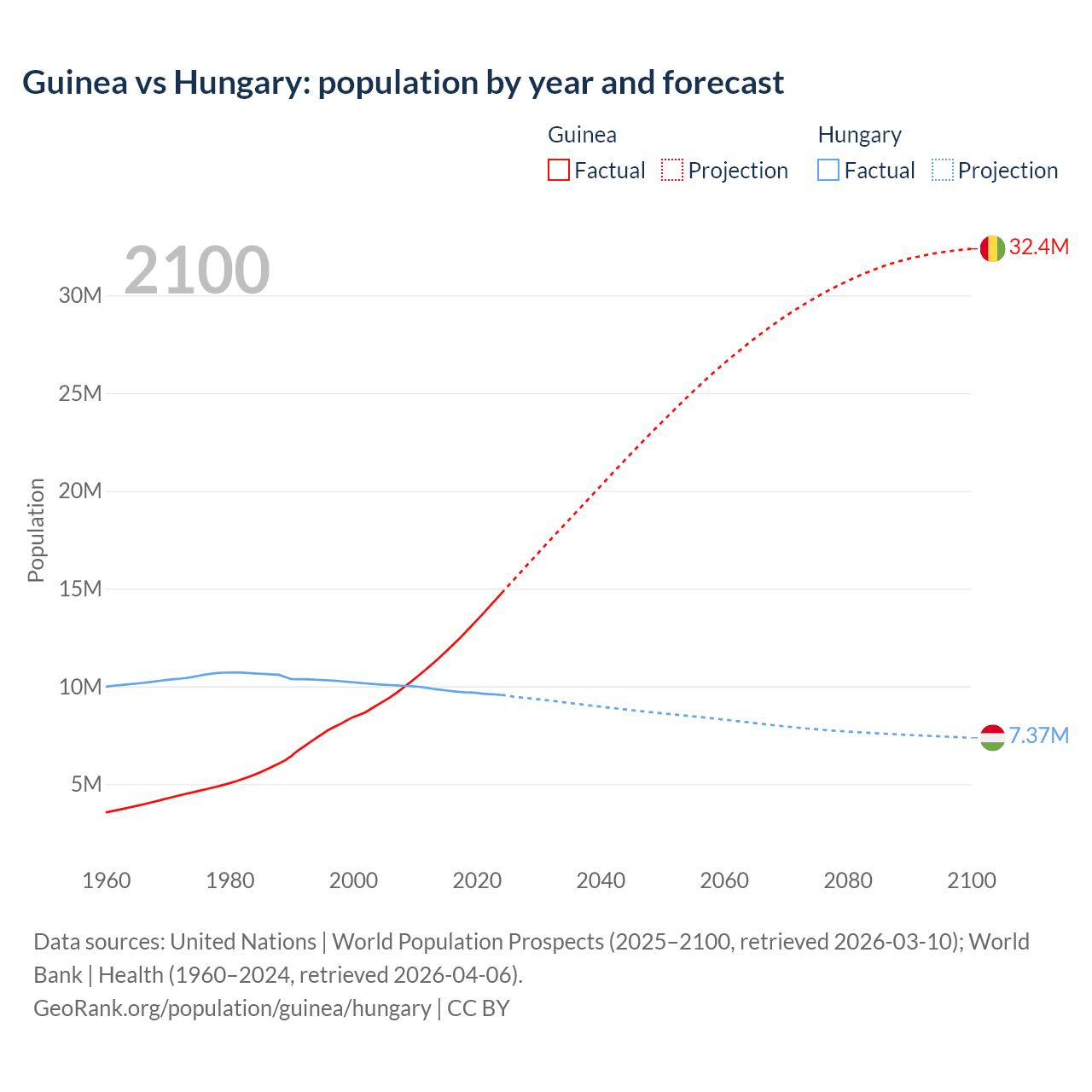 Guinea vs Hungary: population by year and forecast