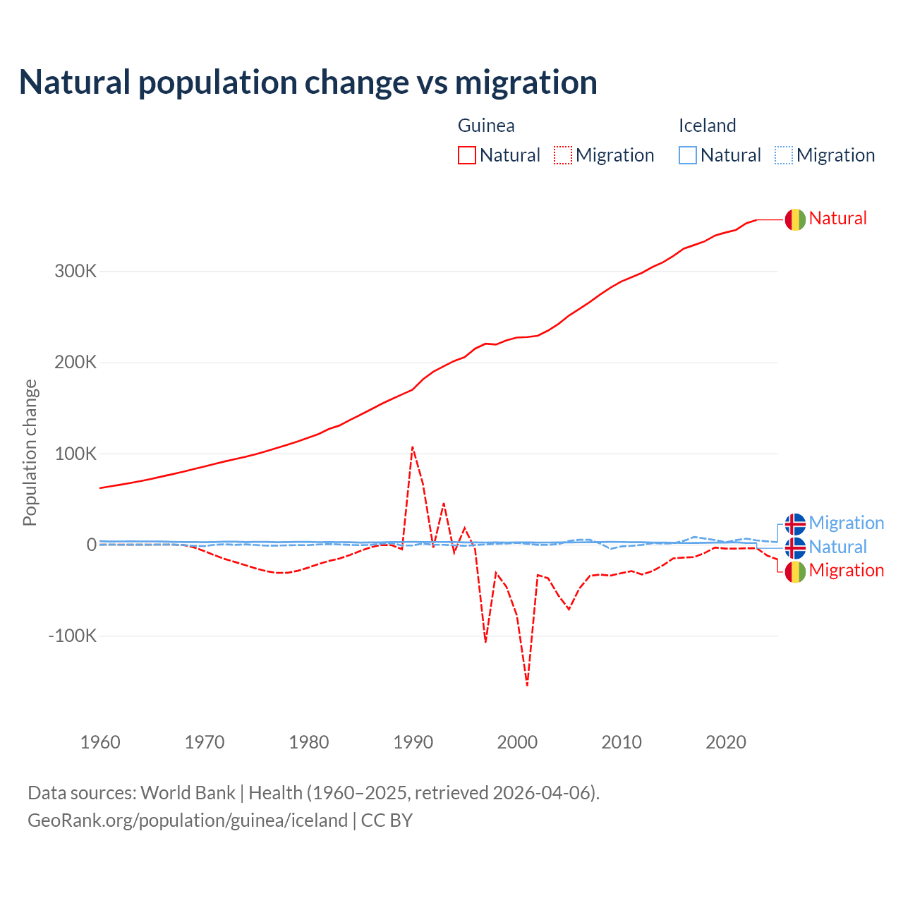 Over the last 10 years, 97.2% of the population change in Guinea is from natural causes (a gain of 3,346,936 people) and 2.76% is from migration (a loss of 94,924 people). In Iceland 30.7% is from natural causes (a gain of 20,128 people) and 69.3% is from migration (a gain of 45,356 people).