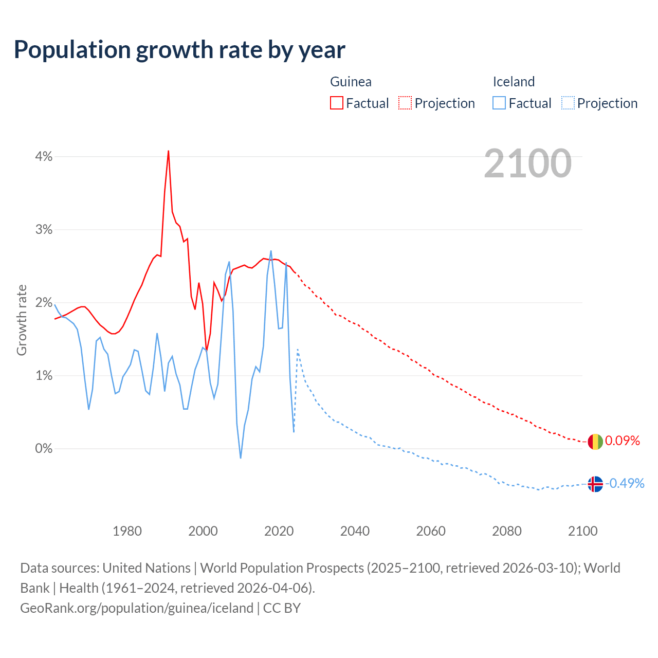 - For the last 10 years, Guinea has had an average growth rate of +2.54% per year vs +1.63% in Iceland.