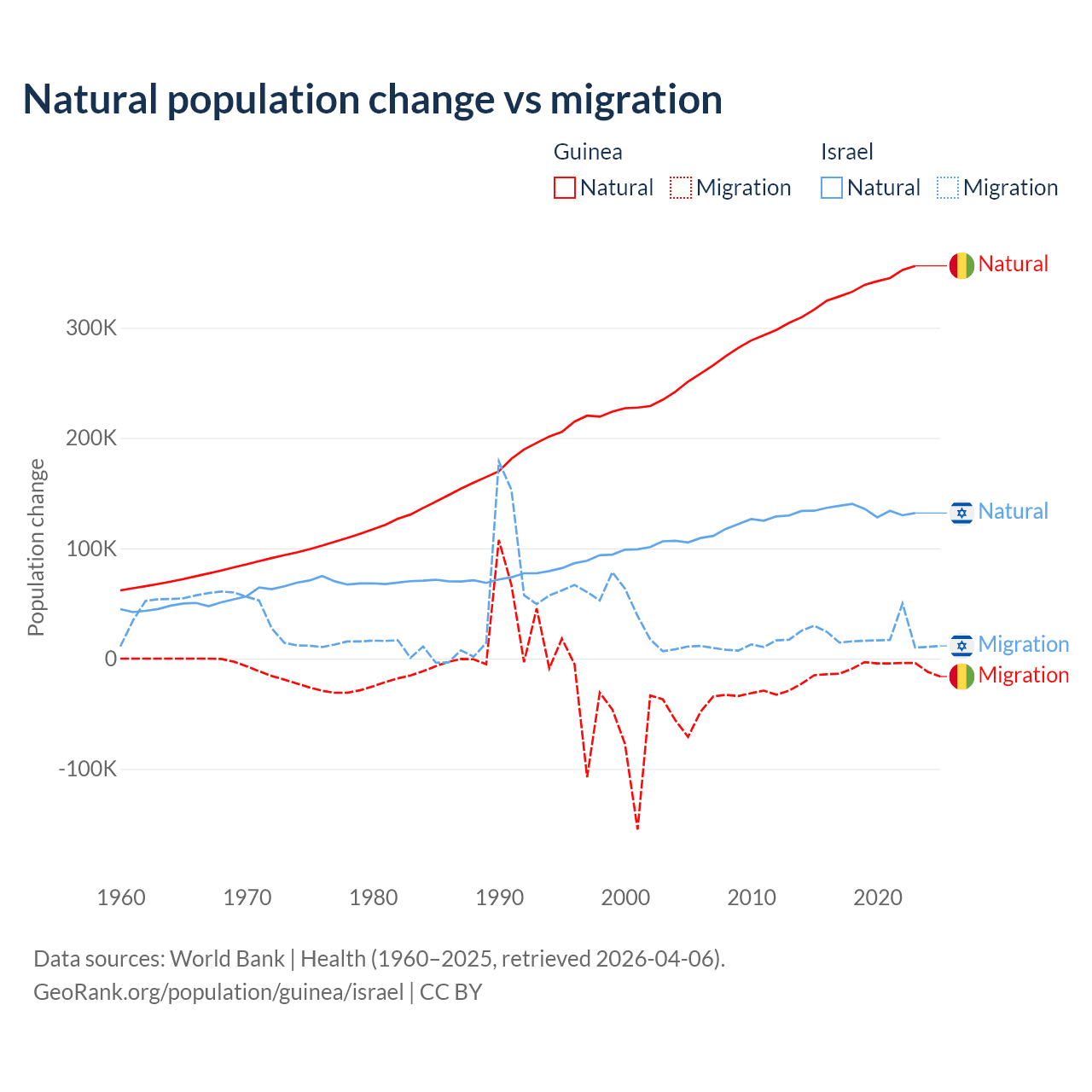 Over the last 10 years, 97.2% of the population change in Guinea is from natural causes (a gain of 3,346,936 people) and 2.76% is from migration (a loss of 94,924 people). In Israel 86% is from natural causes (a gain of 1,343,492 people) and 14% is from migration (a gain of 219,048 people).