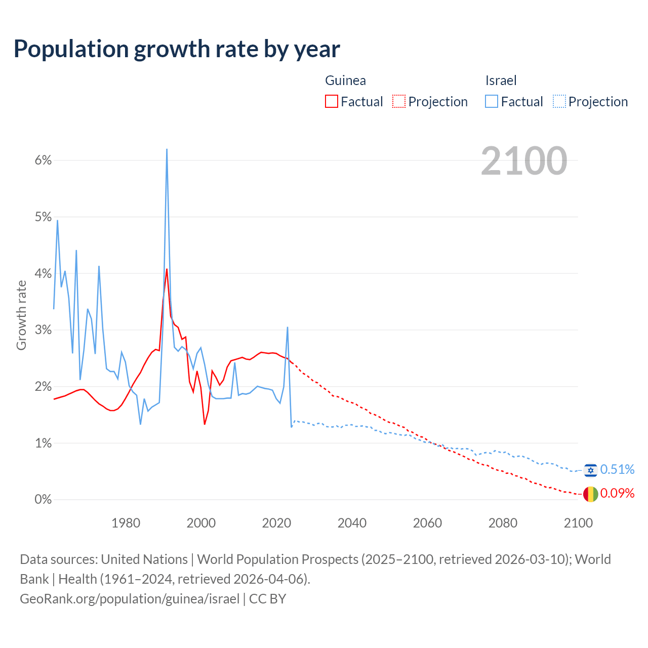 - For the last 10 years, Guinea has had an average growth rate of +2.54% per year vs +1.96% in Israel.