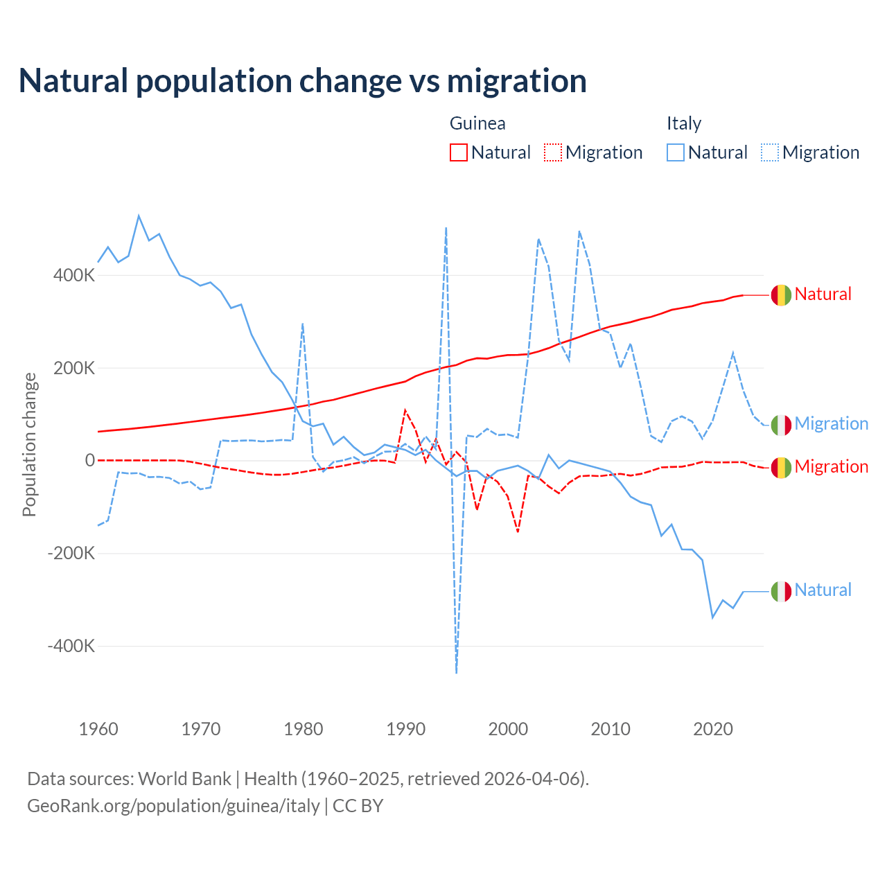 Over the last 10 years, 97.2% of the population change in Guinea is from natural causes (a gain of 3,346,936 people) and 2.76% is from migration (a loss of 94,924 people). In Italy 68.6% is from natural causes (a loss of 2,239,084 people) and 31.4% is from migration (a gain of 1,026,128 people).