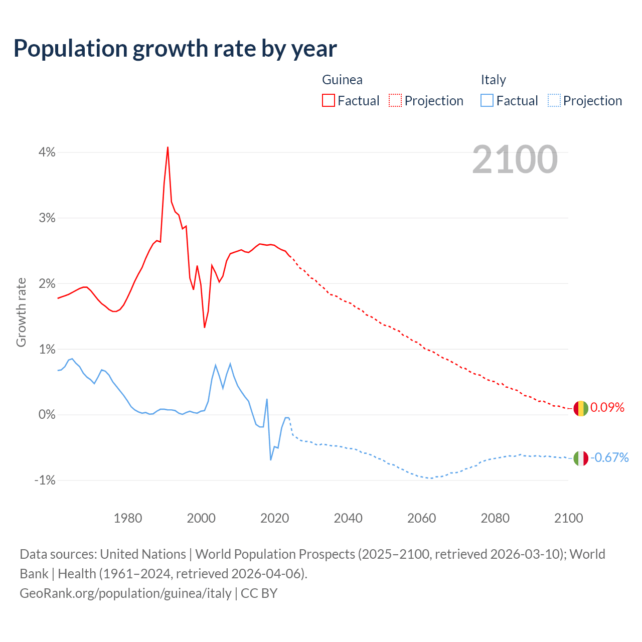 - For the last 10 years, Guinea has had an average growth rate of +2.54% per year vs -0.21% in Italy.