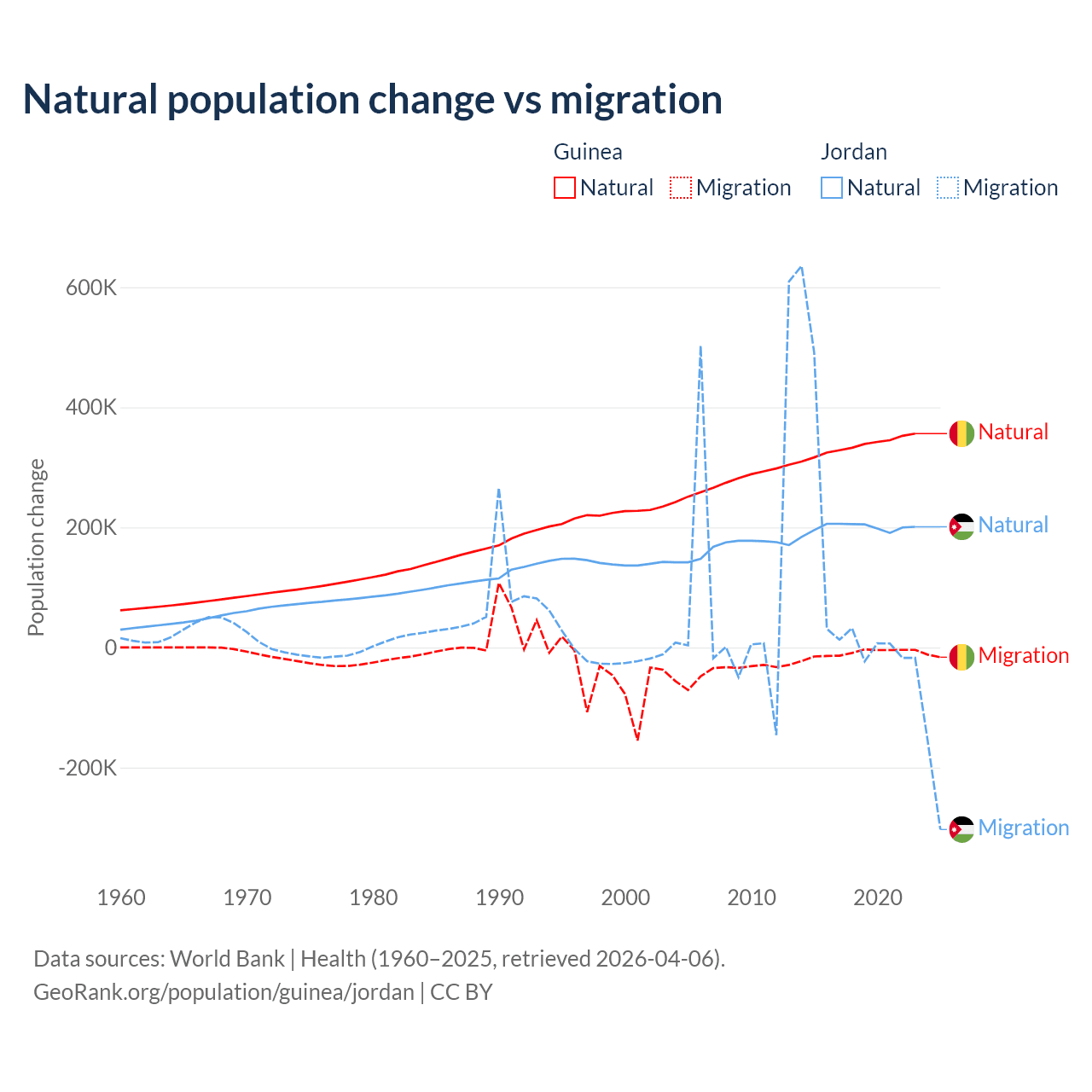 Over the last 10 years, 97.2% of the population change in Guinea is from natural causes (a gain of 3,346,936 people) and 2.76% is from migration (a loss of 94,924 people). In Jordan 63.2% is from natural causes (a gain of 1,991,452 people) and 36.8% is from migration (a gain of 1,157,625 people).
