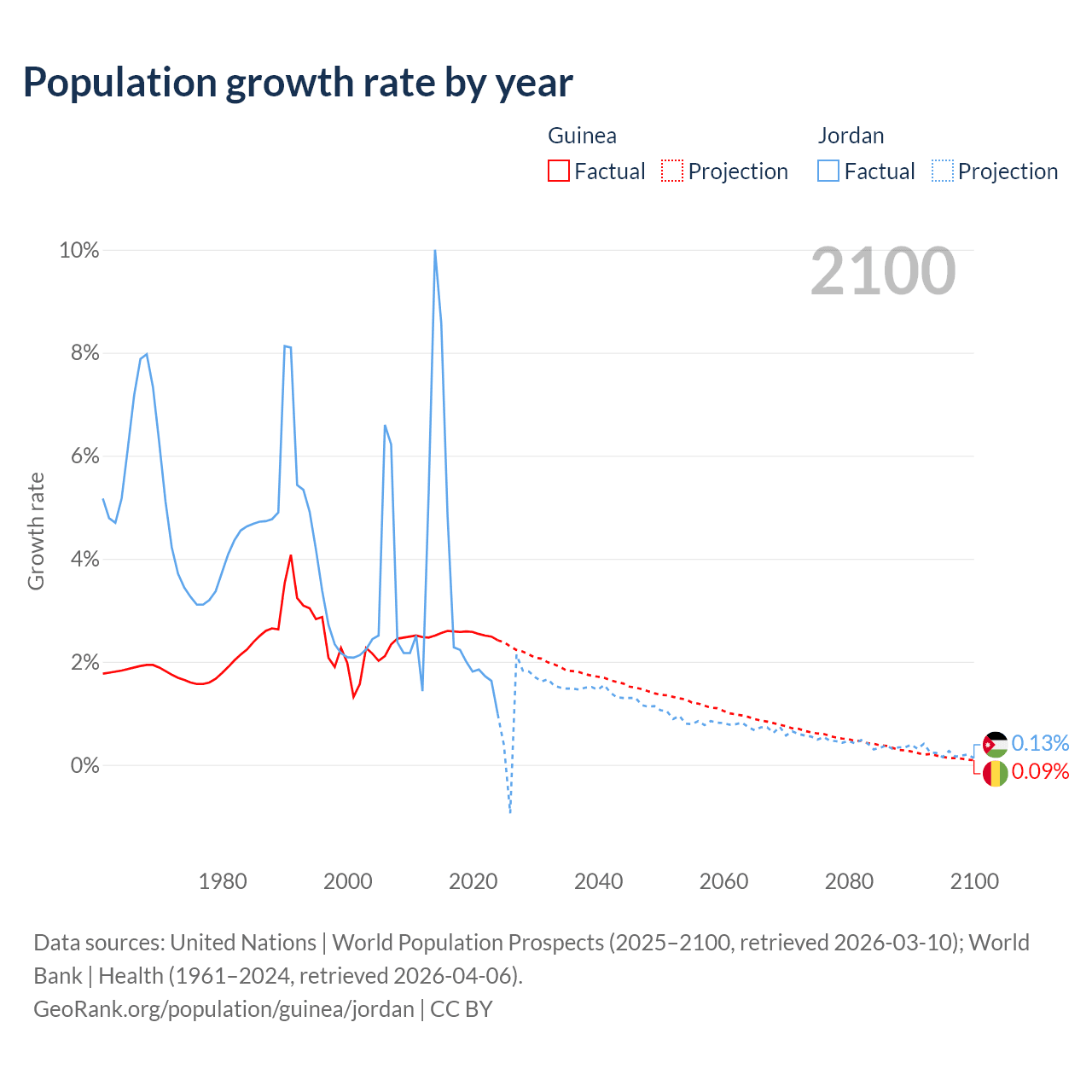 - For the last 10 years, Guinea has had an average growth rate of +2.54% per year vs +3.45% in Jordan.