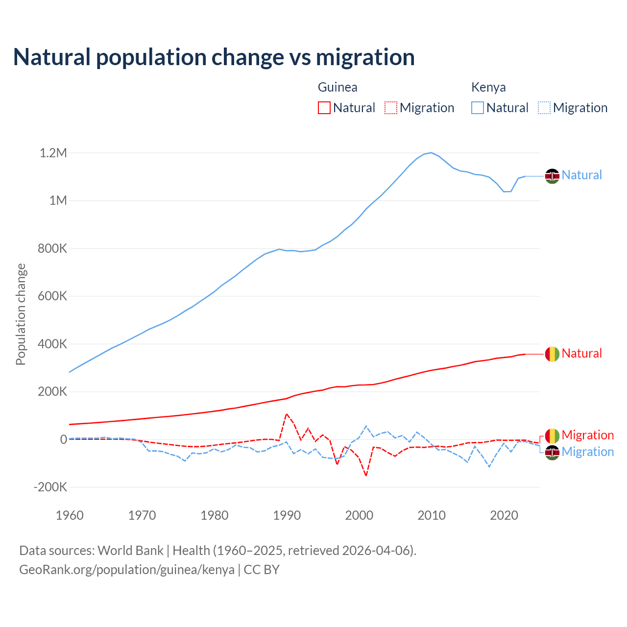 Over the last 10 years, 97.2% of the population change in Guinea is from natural causes (a gain of 3,346,936 people) and 2.76% is from migration (a loss of 94,924 people). In Kenya 95.3% is from natural causes (a gain of 10,892,362 people) and 4.67% is from migration (a loss of 533,876 people).