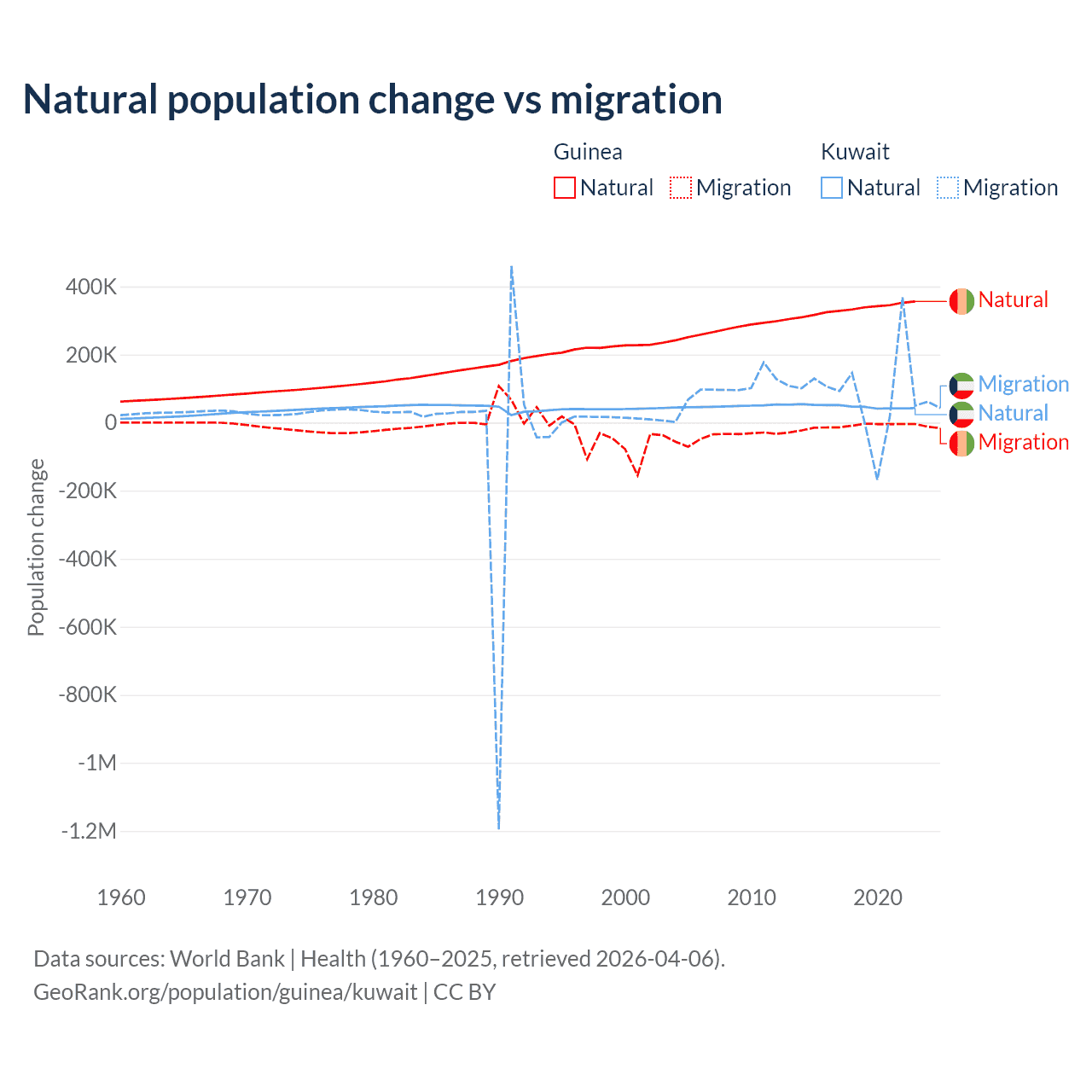 Over the last 10 years, 97.2% of the population change in Guinea is from natural causes (a gain of 3,346,936 people) and 2.76% is from migration (a loss of 94,924 people). In Kuwait 35.8% is from natural causes (a gain of 470,645 people) and 64.2% is from migration (a gain of 845,142 people).