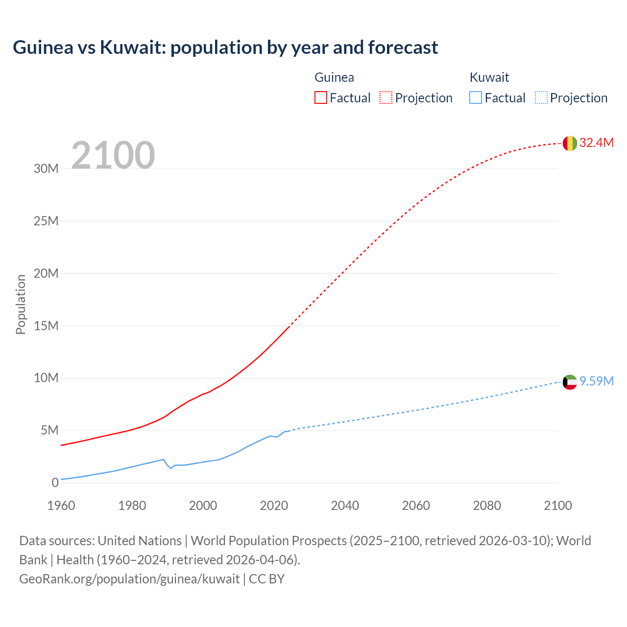 The latest officially reported population of Guinea was 14,754,785 in 2024 vs 4,897,263 people in Kuwait in 2024. In 2026, based on the adjusted UN estimation, the current Guinea's population is 15,546,235 people compared to 5,100,145 in Kuwait.
