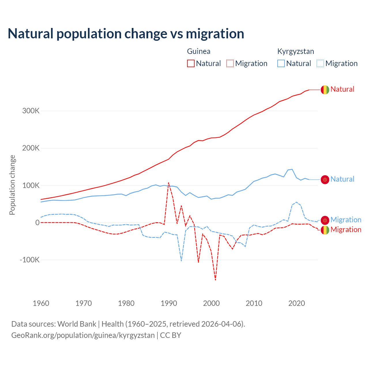 Over the last 10 years, 97.2% of the population change in Guinea is from natural causes (a gain of 3,346,936 people) and 2.76% is from migration (a loss of 94,924 people). In Kyrgyzstan 88.5% is from natural causes (a gain of 1,258,837 people) and 11.5% is from migration (a gain of 164,132 people).