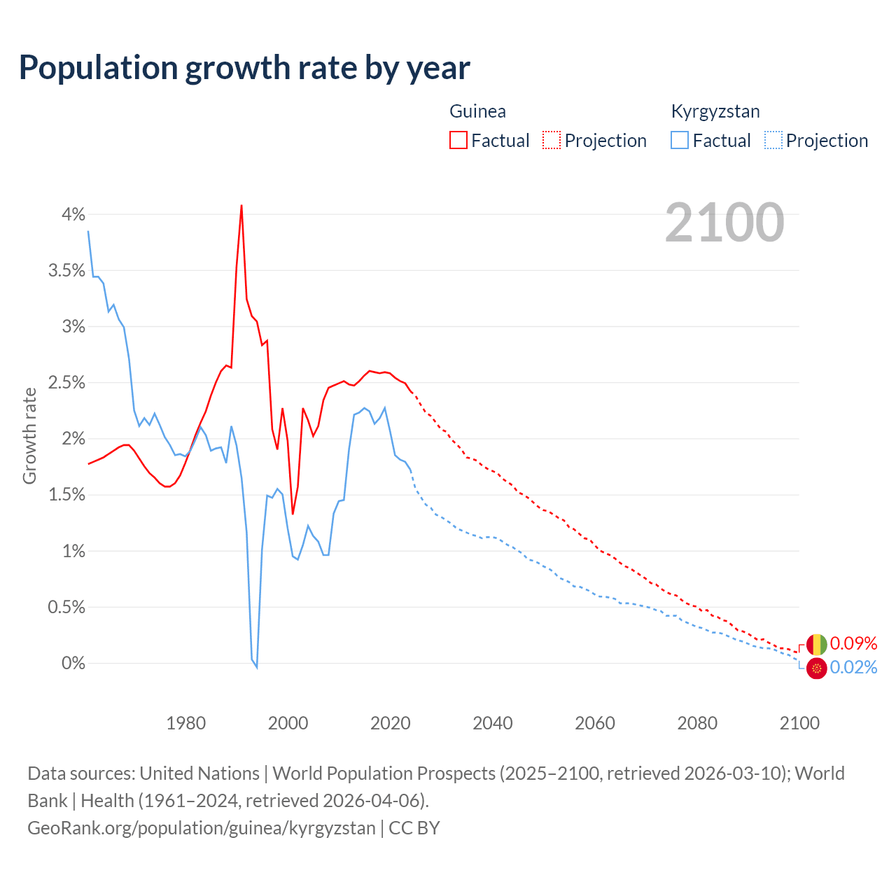 - For the last 10 years, Guinea has had an average growth rate of +2.54% per year vs +2.05% in Kyrgyzstan.