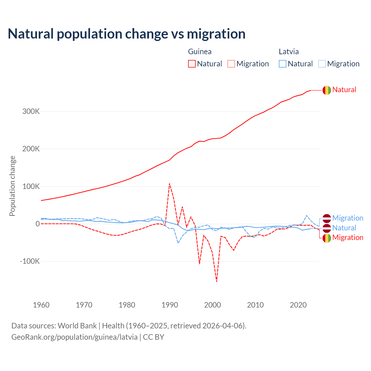 Over the last 10 years, 97.2% of the population change in Guinea is from natural causes (a gain of 3,346,936 people) and 2.76% is from migration (a loss of 94,924 people). In Latvia 82.7% is from natural causes (a loss of 103,711 people) and 17.3% is from migration (a loss of 21,641 people).