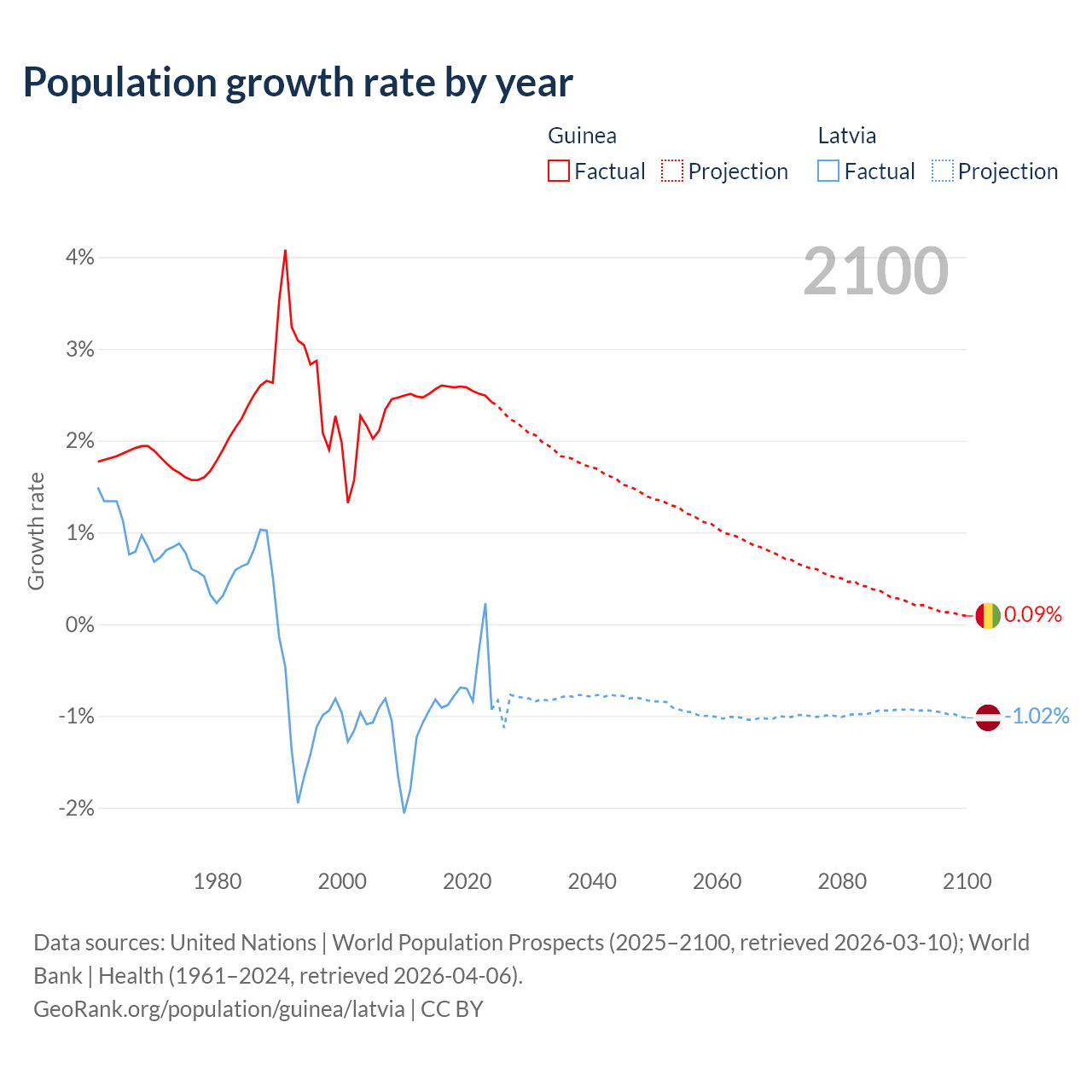 - For the last 10 years, Guinea has had an average growth rate of +2.54% per year vs -0.68% in Latvia.
