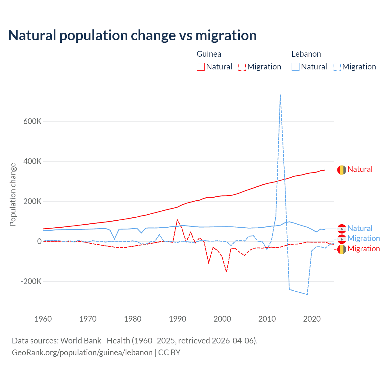 Over the last 10 years, 97.2% of the population change in Guinea is from natural causes (a gain of 3,346,936 people) and 2.76% is from migration (a loss of 94,924 people). In Lebanon 40.1% is from natural causes (a gain of 739,256 people) and 59.9% is from migration (a loss of 1,103,772 people).