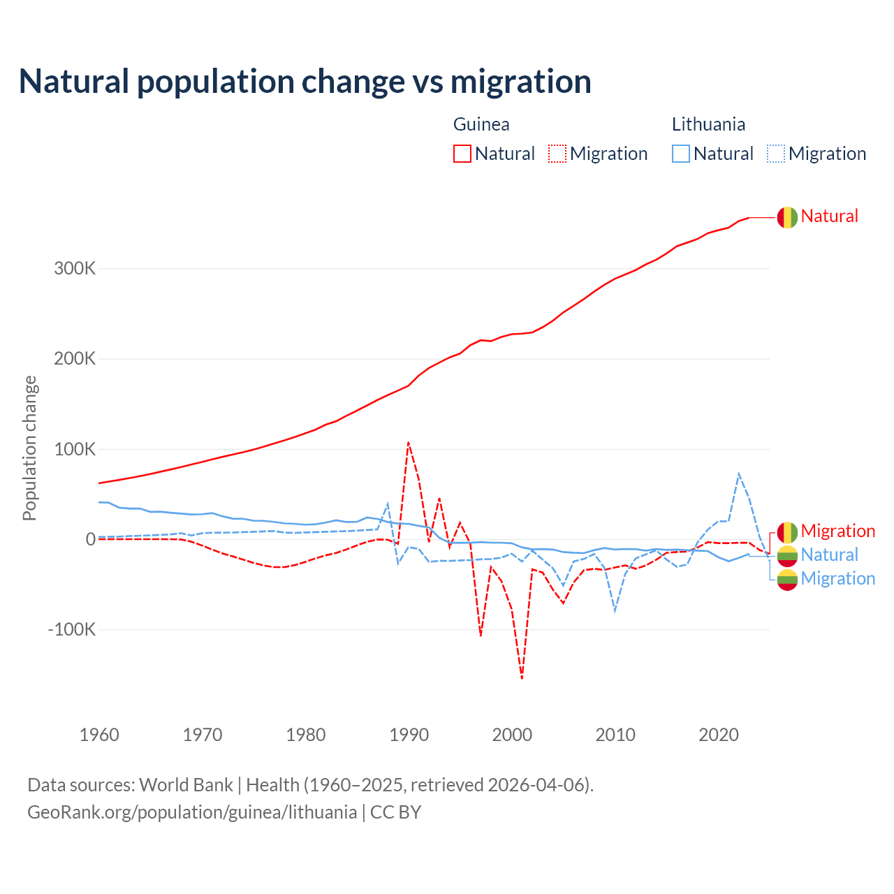 Over the last 10 years, 97.2% of the population change in Guinea is from natural causes (a gain of 3,346,936 people) and 2.76% is from migration (a loss of 94,924 people). In Lithuania 68.7% is from natural causes (a loss of 153,859 people) and 31.3% is from migration (a gain of 70,196 people).