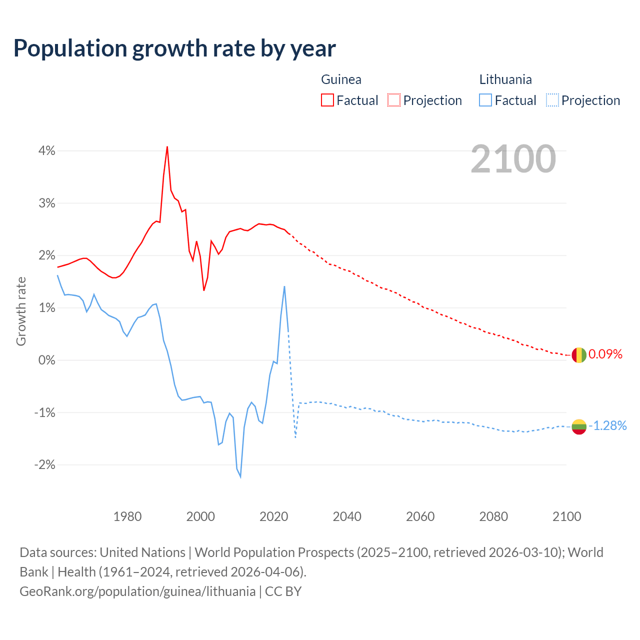 - For the last 10 years, Guinea has had an average growth rate of +2.54% per year vs -0.22% in Lithuania.
