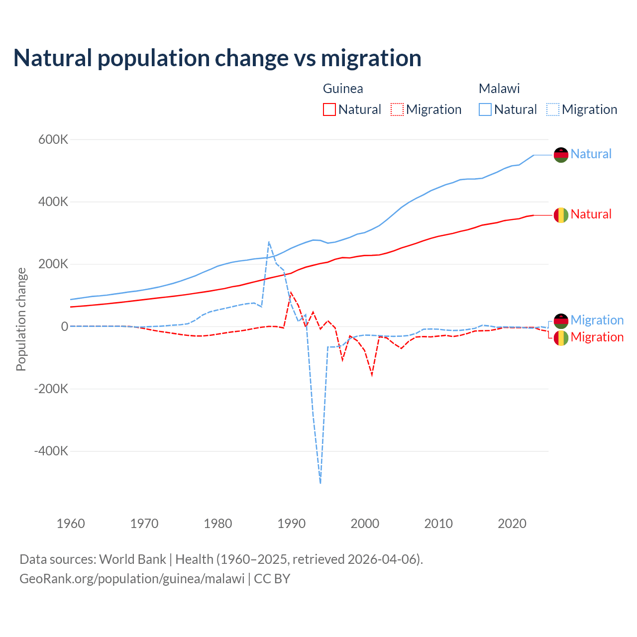 Over the last 10 years, 97.2% of the population change in Guinea is from natural causes (a gain of 3,346,936 people) and 2.76% is from migration (a loss of 94,924 people). In Malawi 99.3% is from natural causes (a gain of 5,019,393 people) and 0.67% is from migration (a loss of 33,768 people).