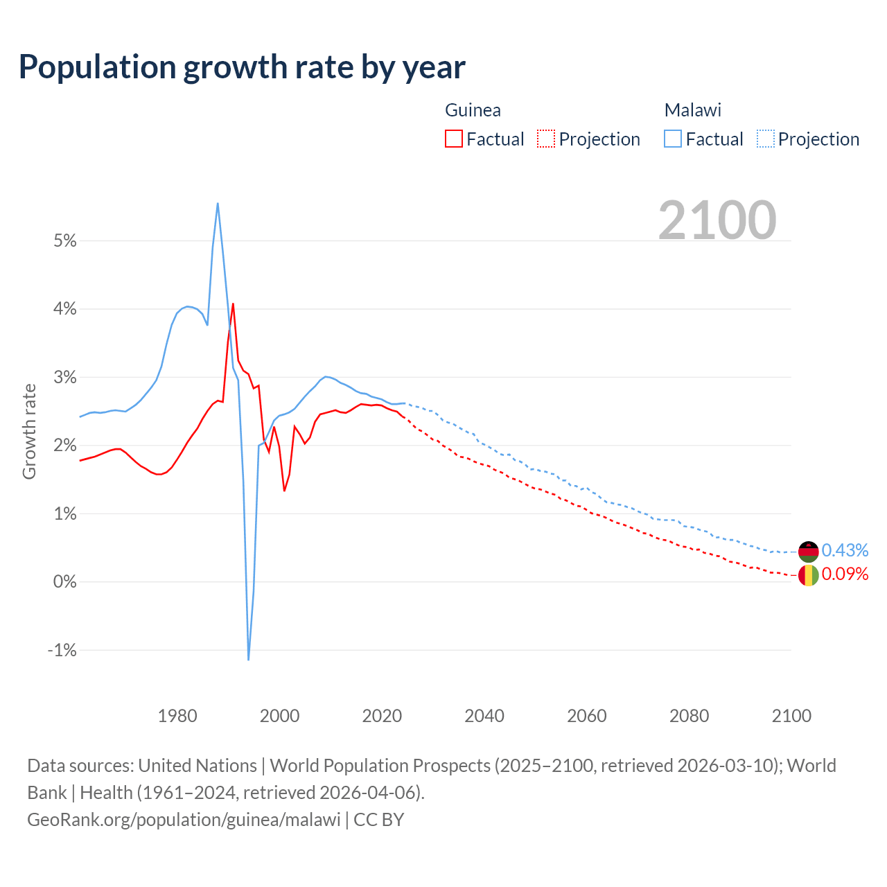 - For the last 10 years, Guinea has had an average growth rate of +2.54% per year vs +2.7% in Malawi.