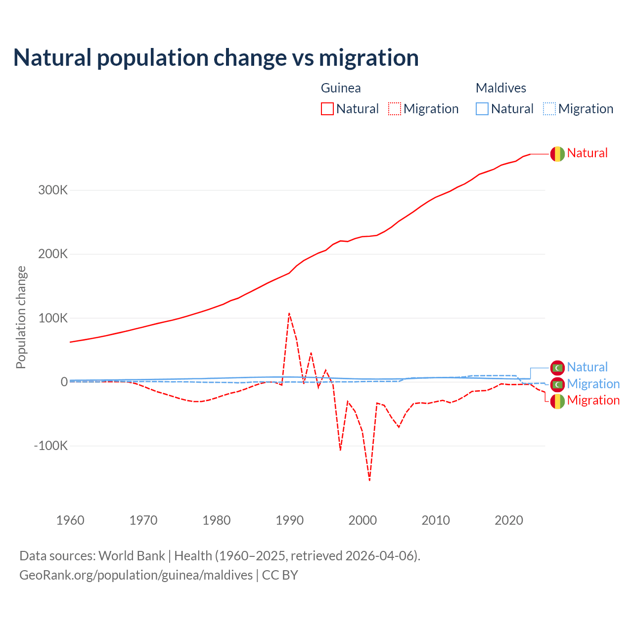 Over the last 10 years, 97.2% of the population change in Guinea is from natural causes (a gain of 3,346,936 people) and 2.76% is from migration (a loss of 94,924 people). In Maldives 42.7% is from natural causes (a gain of 51,342 people) and 57.3% is from migration (a gain of 68,788 people).