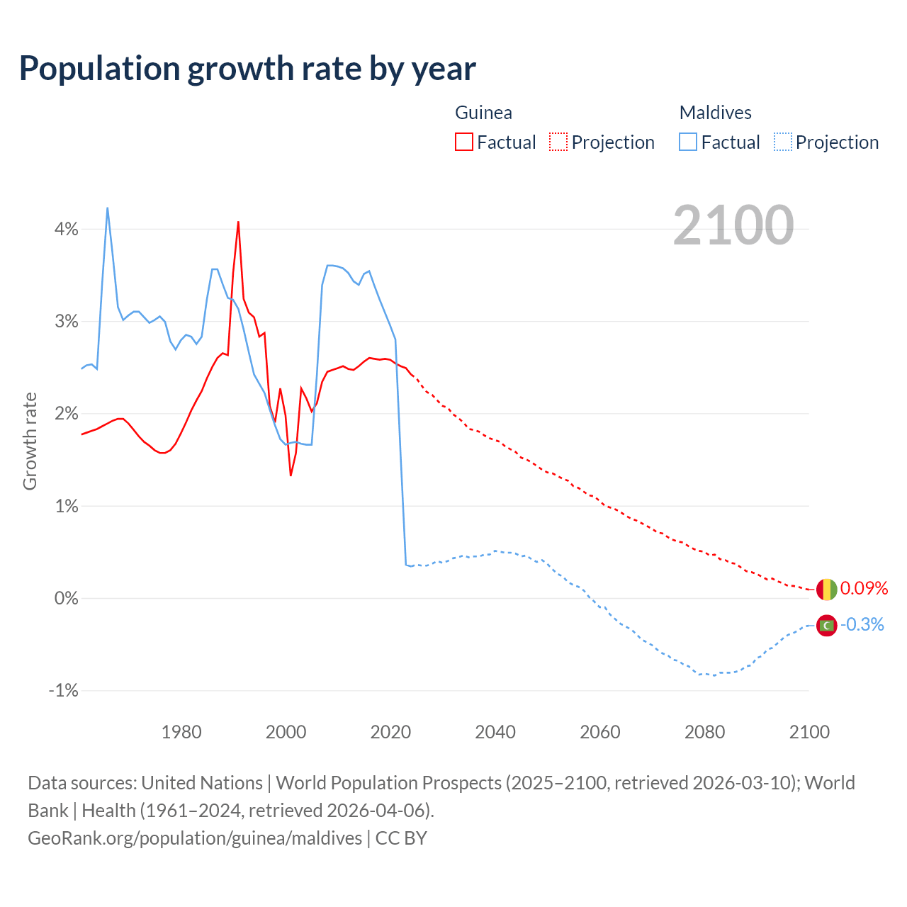 - For the last 10 years, Guinea has had an average growth rate of +2.54% per year vs +2.56% in Maldives.