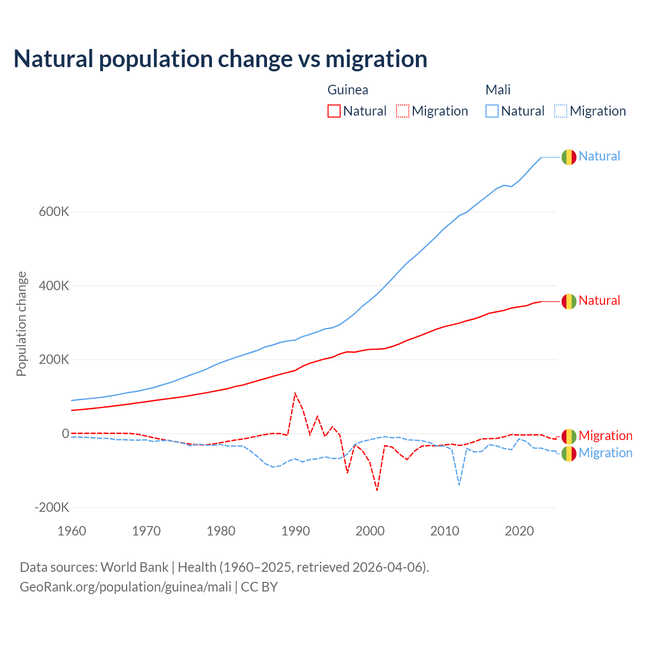 Over the last 10 years, 97.2% of the population change in Guinea is from natural causes (a gain of 3,346,936 people) and 2.76% is from migration (a loss of 94,924 people). In Mali 94.9% is from natural causes (a gain of 6,749,473 people) and 5.13% is from migration (a loss of 365,292 people).