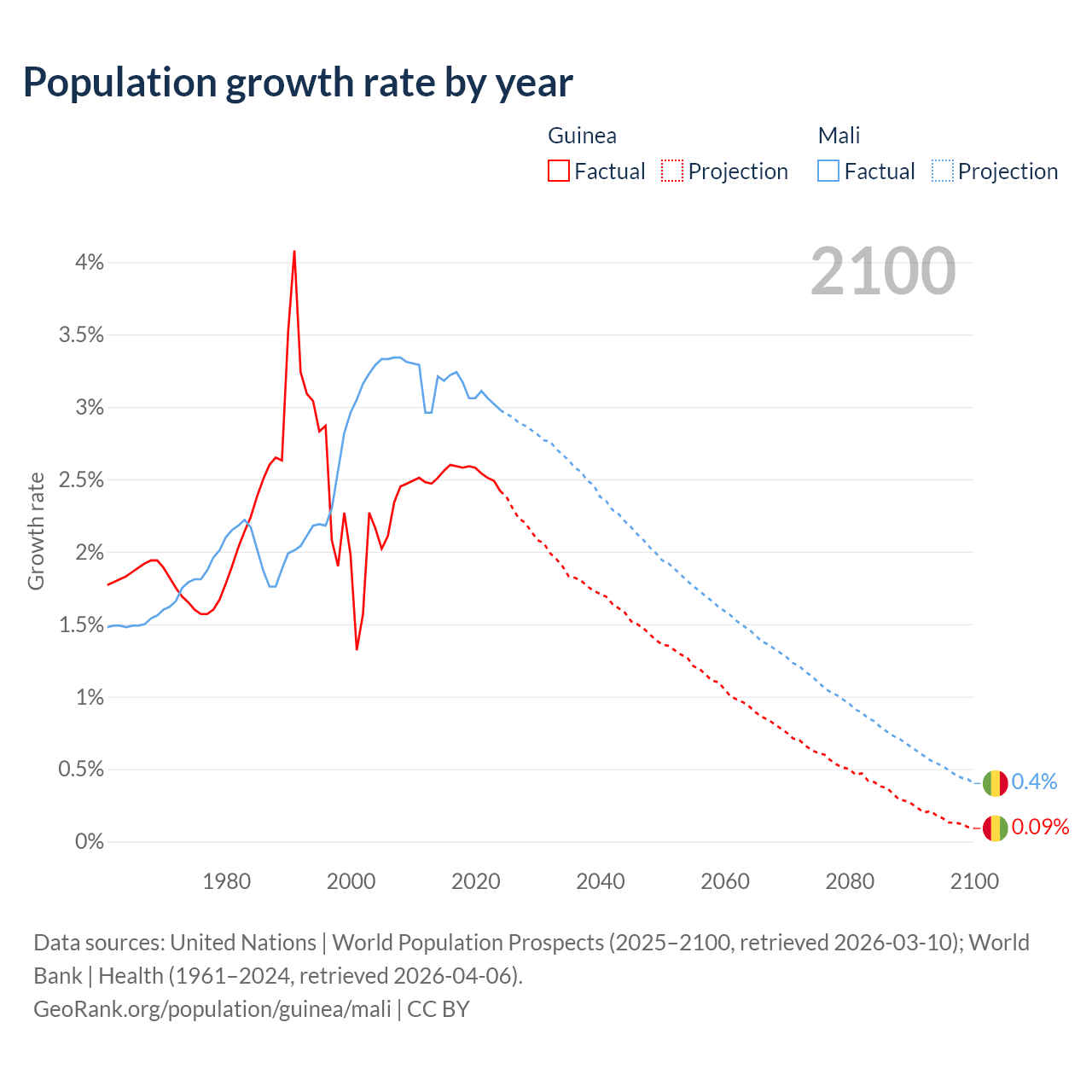 - For the last 10 years, Guinea has had an average growth rate of +2.54% per year vs +3.12% in Mali.