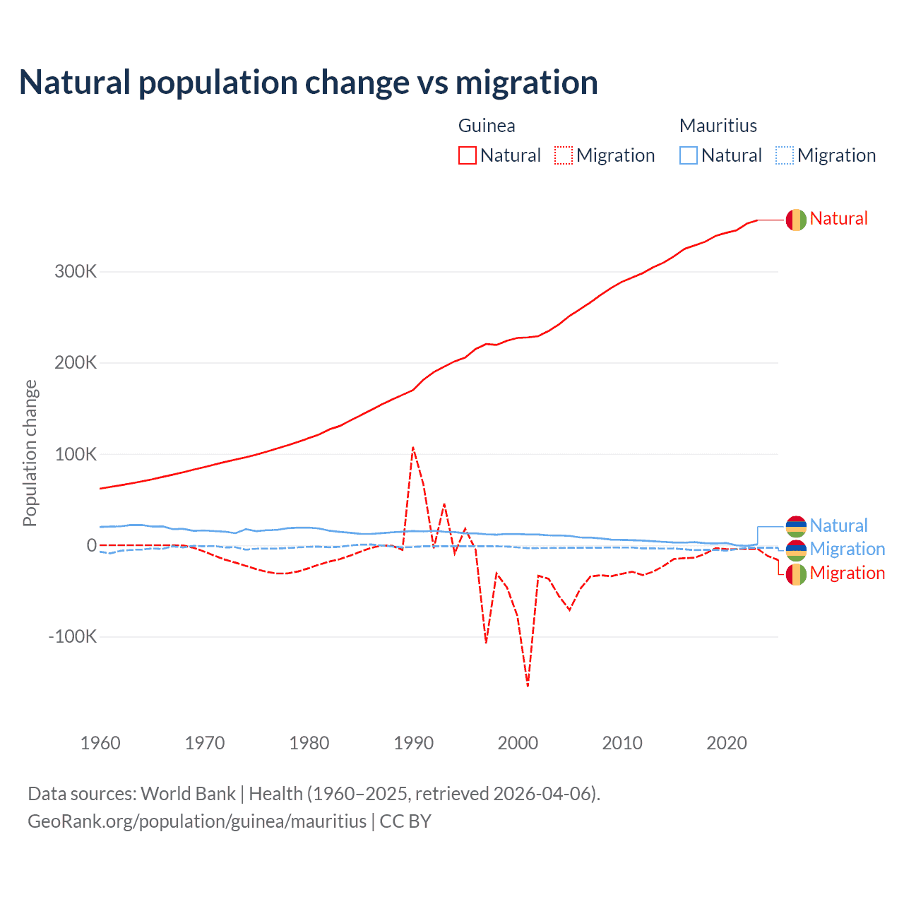 Over the last 10 years, 97.2% of the population change in Guinea is from natural causes (a gain of 3,346,936 people) and 2.76% is from migration (a loss of 94,924 people). In Mauritius 30.9% is from natural causes (a gain of 19,327 people) and 69.1% is from migration (a loss of 43,294 people).