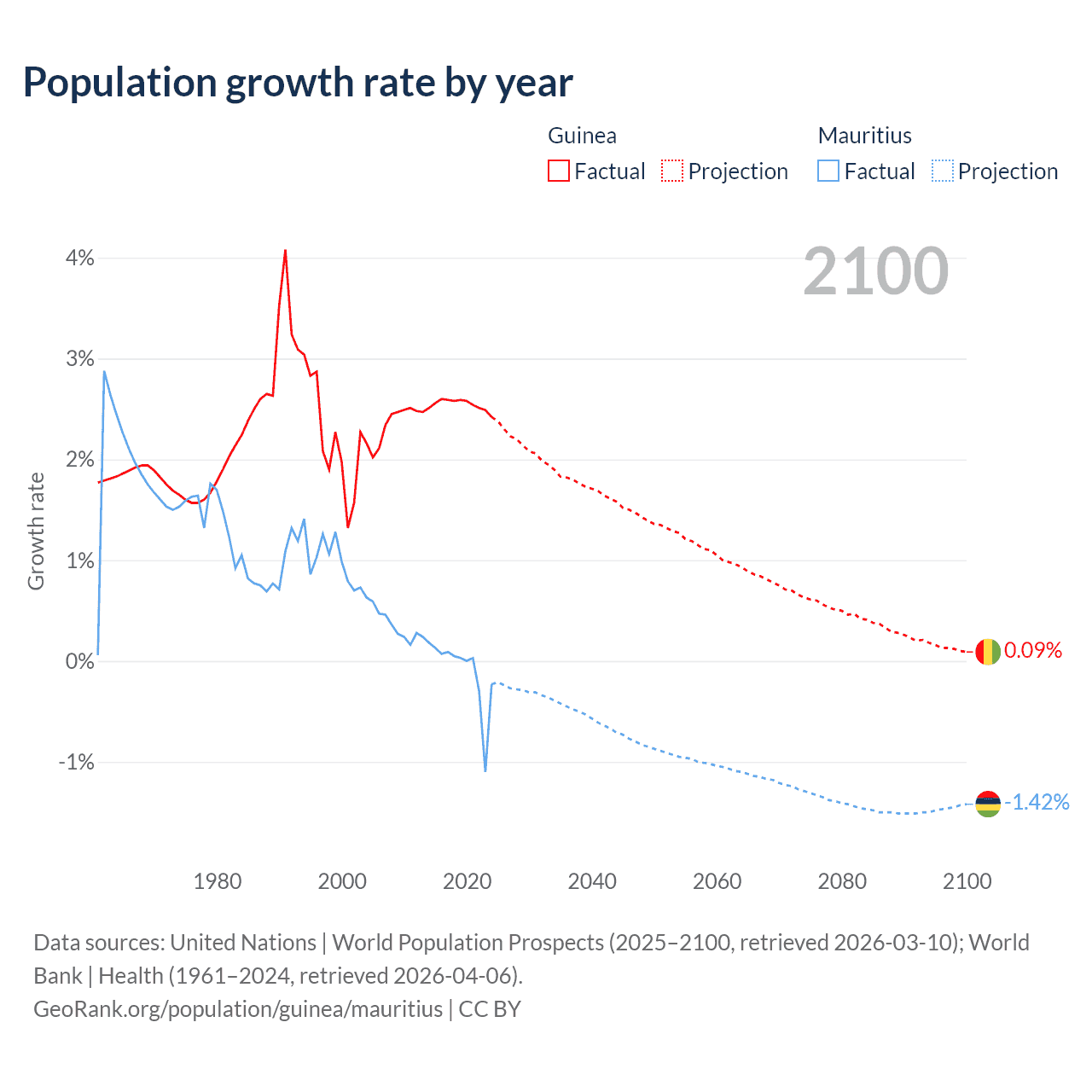 - For the last 10 years, Guinea has had an average growth rate of +2.54% per year vs -0.09% in Mauritius.
