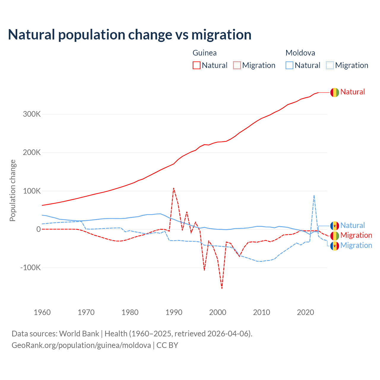 Over the last 10 years, 97.2% of the population change in Guinea is from natural causes (a gain of 3,346,936 people) and 2.76% is from migration (a loss of 94,924 people). In Moldova 6.04% is from natural causes (a loss of 19,001 people) and 94% is from migration (a loss of 295,631 people).