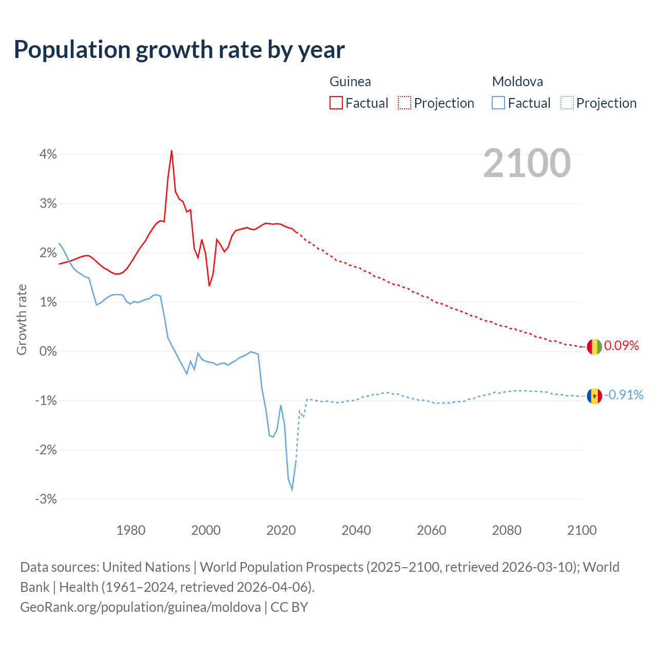 - For the last 10 years, Guinea has had an average growth rate of +2.54% per year vs -1.57% in Moldova.