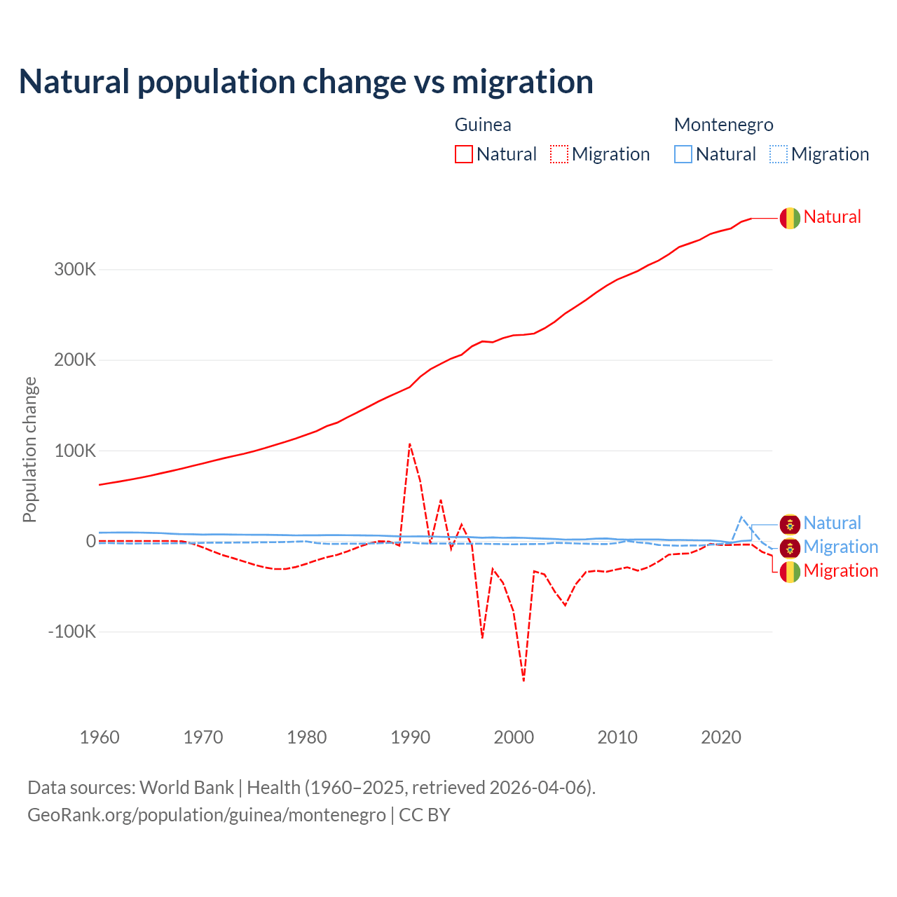 Over the last 10 years, 97.2% of the population change in Guinea is from natural causes (a gain of 3,346,936 people) and 2.76% is from migration (a loss of 94,924 people). In Montenegro 52.4% is from natural causes (a gain of 4,501 people) and 47.6% is from migration (a gain of 4,095 people).