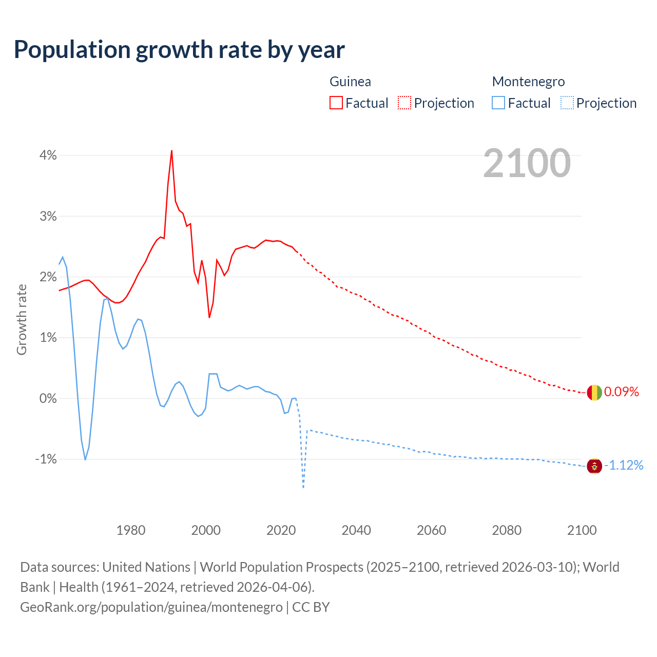- For the last 10 years, Guinea has had an average growth rate of +2.54% per year vs +0.01% in Montenegro.