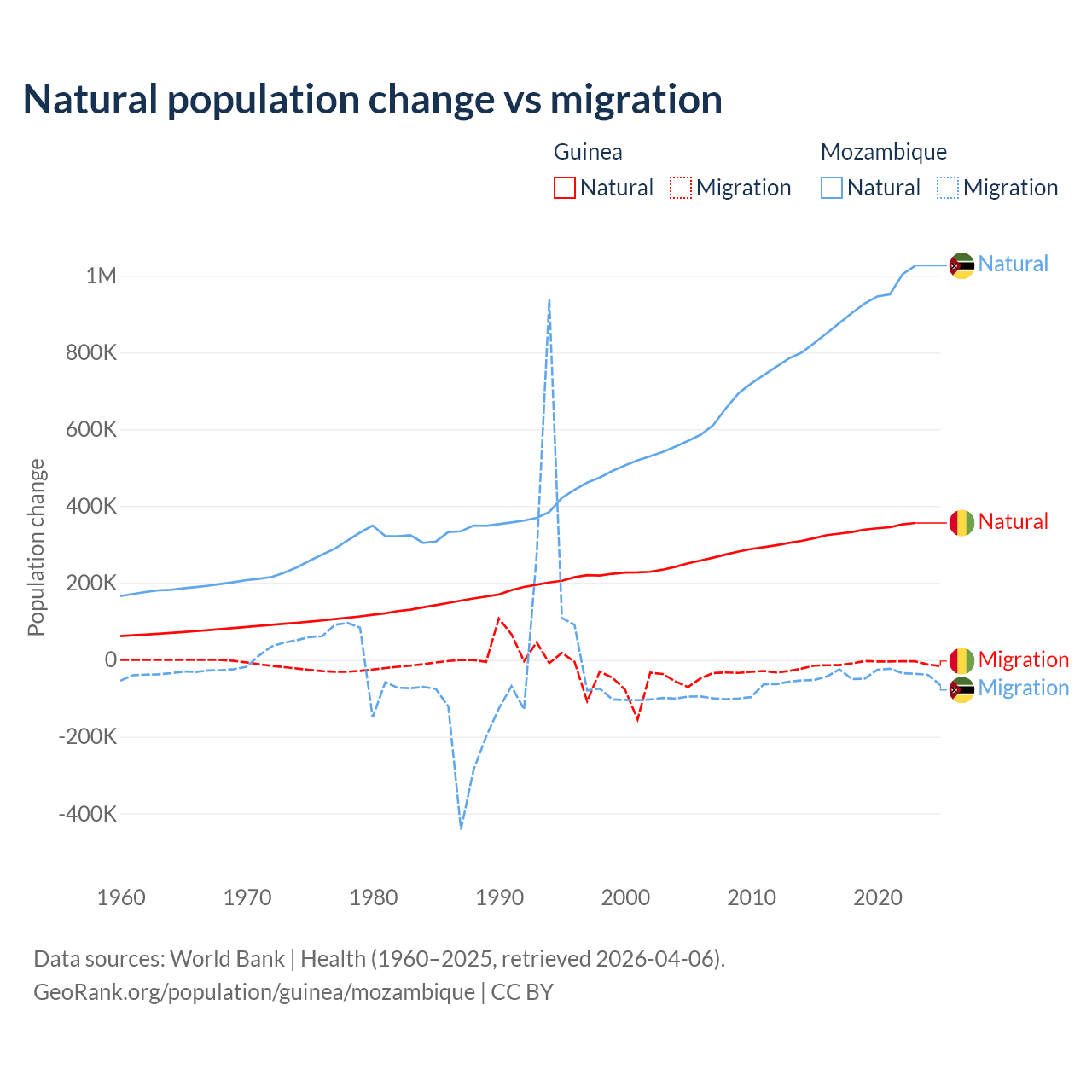 Over the last 10 years, 97.2% of the population change in Guinea is from natural causes (a gain of 3,346,936 people) and 2.76% is from migration (a loss of 94,924 people). In Mozambique 95.9% is from natural causes (a gain of 9,108,203 people) and 4.15% is from migration (a loss of 393,923 people).