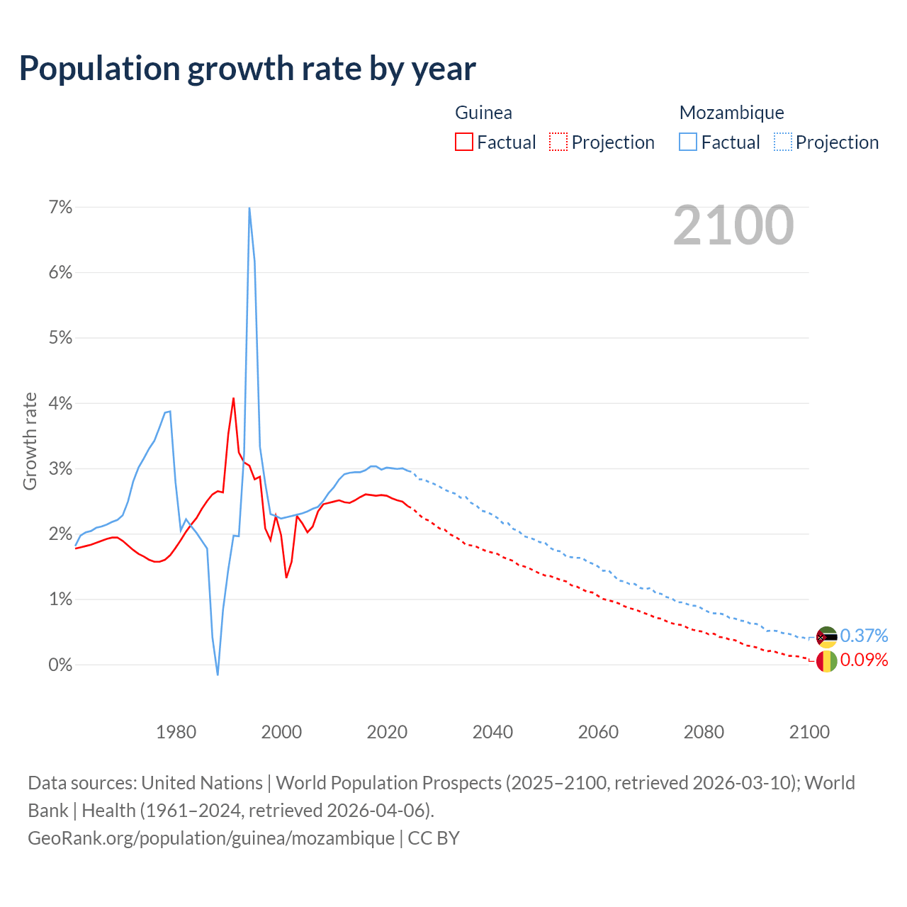 - For the last 10 years, Guinea has had an average growth rate of +2.54% per year vs +2.99% in Mozambique.