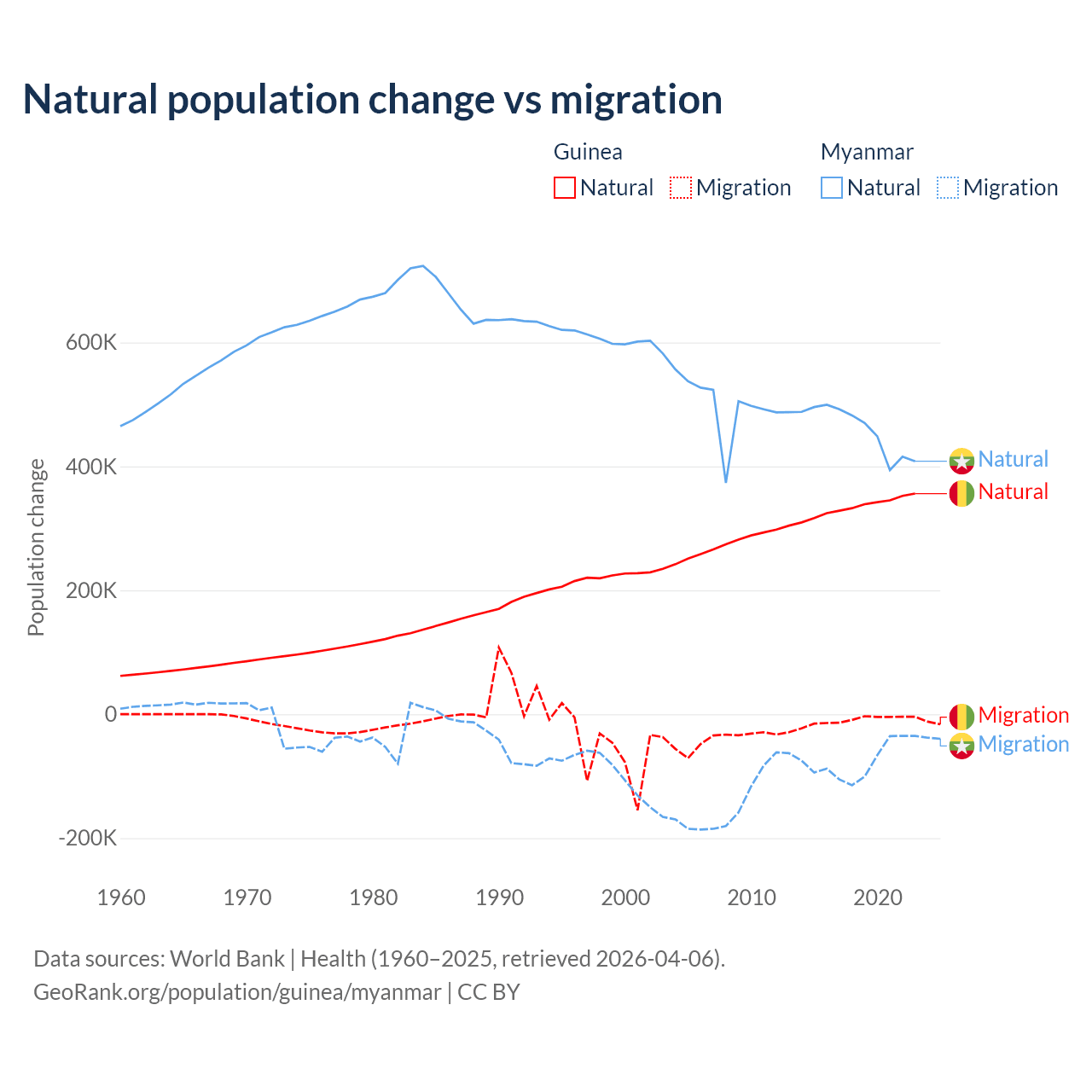 Over the last 10 years, 97.2% of the population change in Guinea is from natural causes (a gain of 3,346,936 people) and 2.76% is from migration (a loss of 94,924 people). In Myanmar 86% is from natural causes (a gain of 4,594,615 people) and 14% is from migration (a loss of 749,272 people).