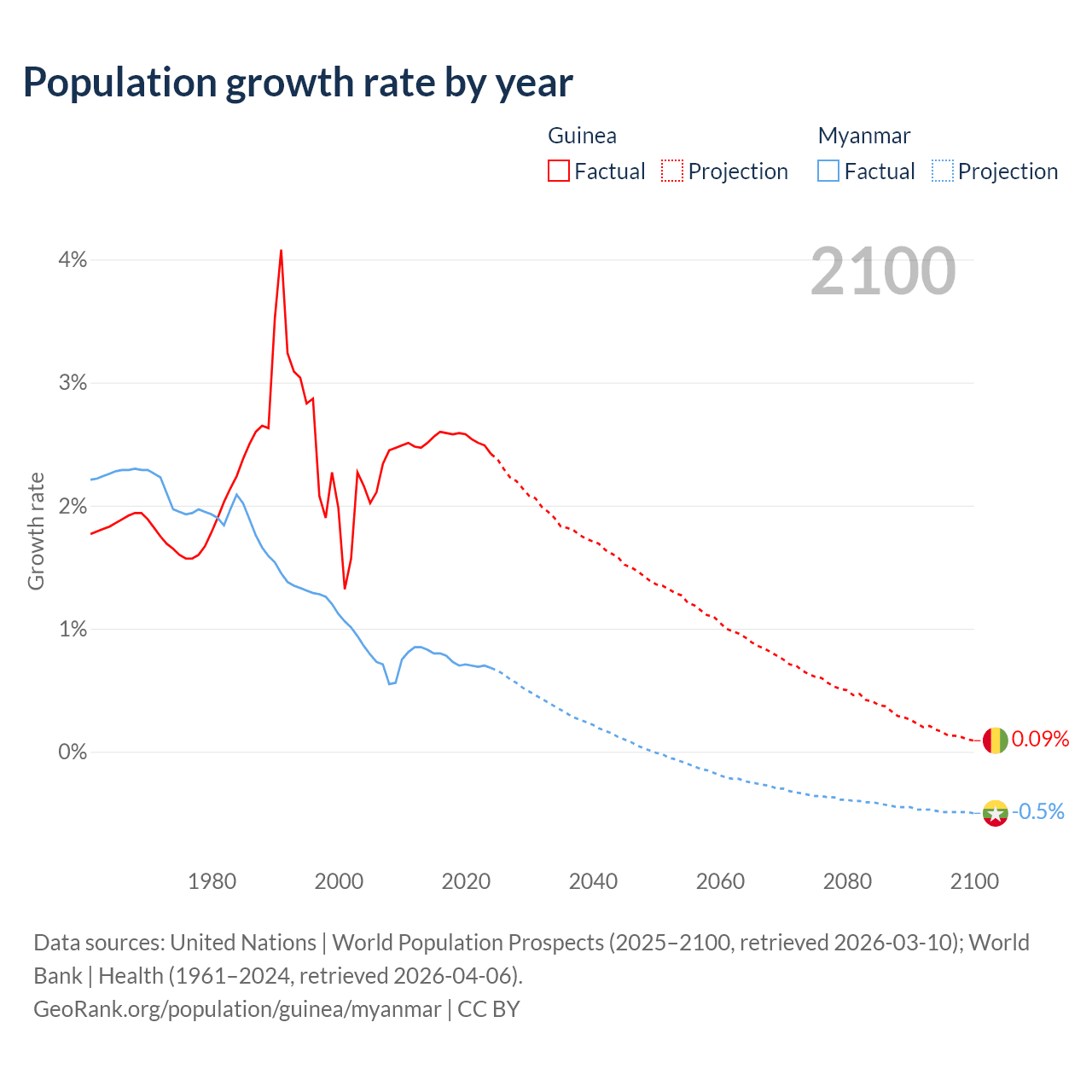 - For the last 10 years, Guinea has had an average growth rate of +2.54% per year vs +0.74% in Myanmar.