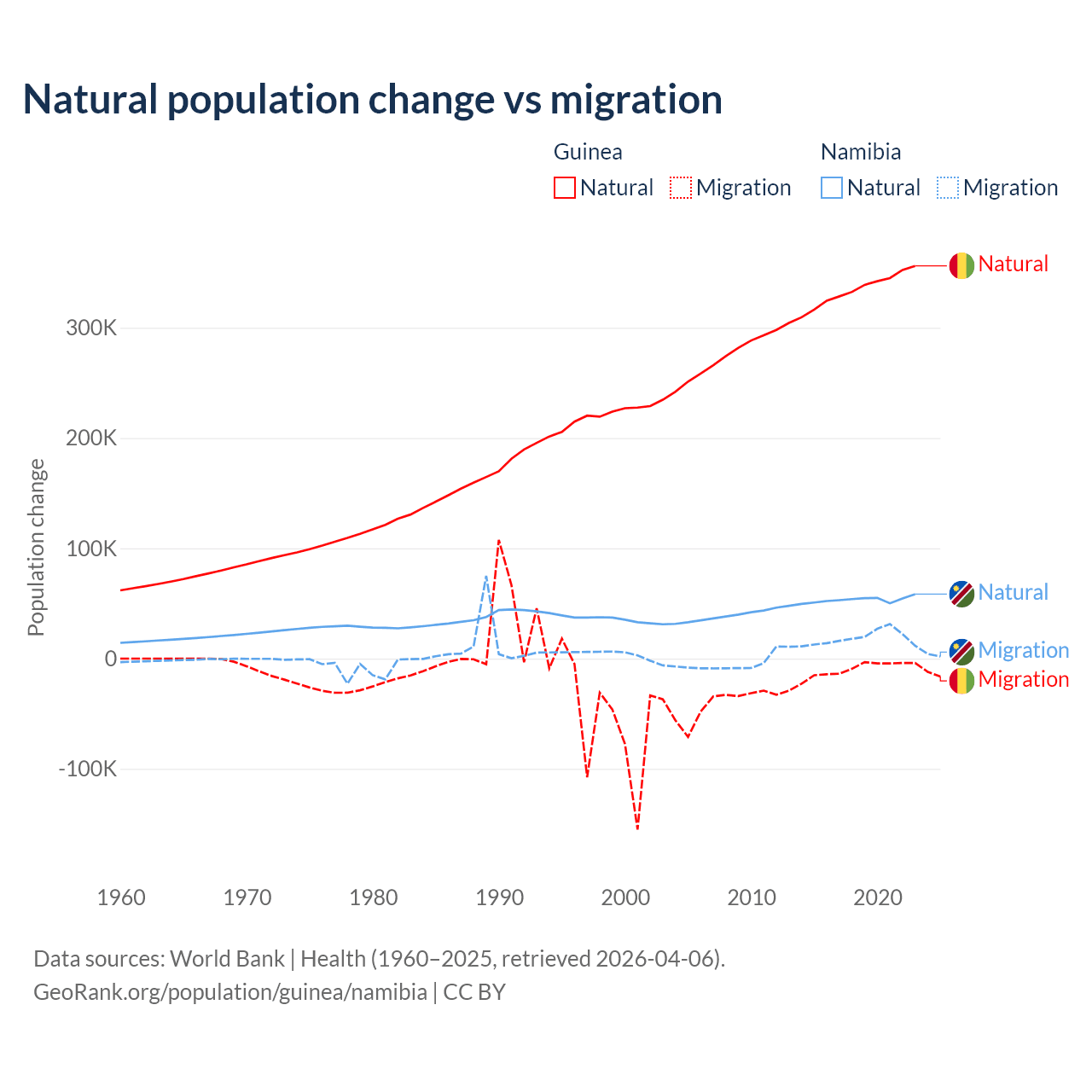 Over the last 10 years, 97.2% of the population change in Guinea is from natural causes (a gain of 3,346,936 people) and 2.76% is from migration (a loss of 94,924 people). In Namibia 74.3% is from natural causes (a gain of 532,532 people) and 25.7% is from migration (a gain of 183,837 people).