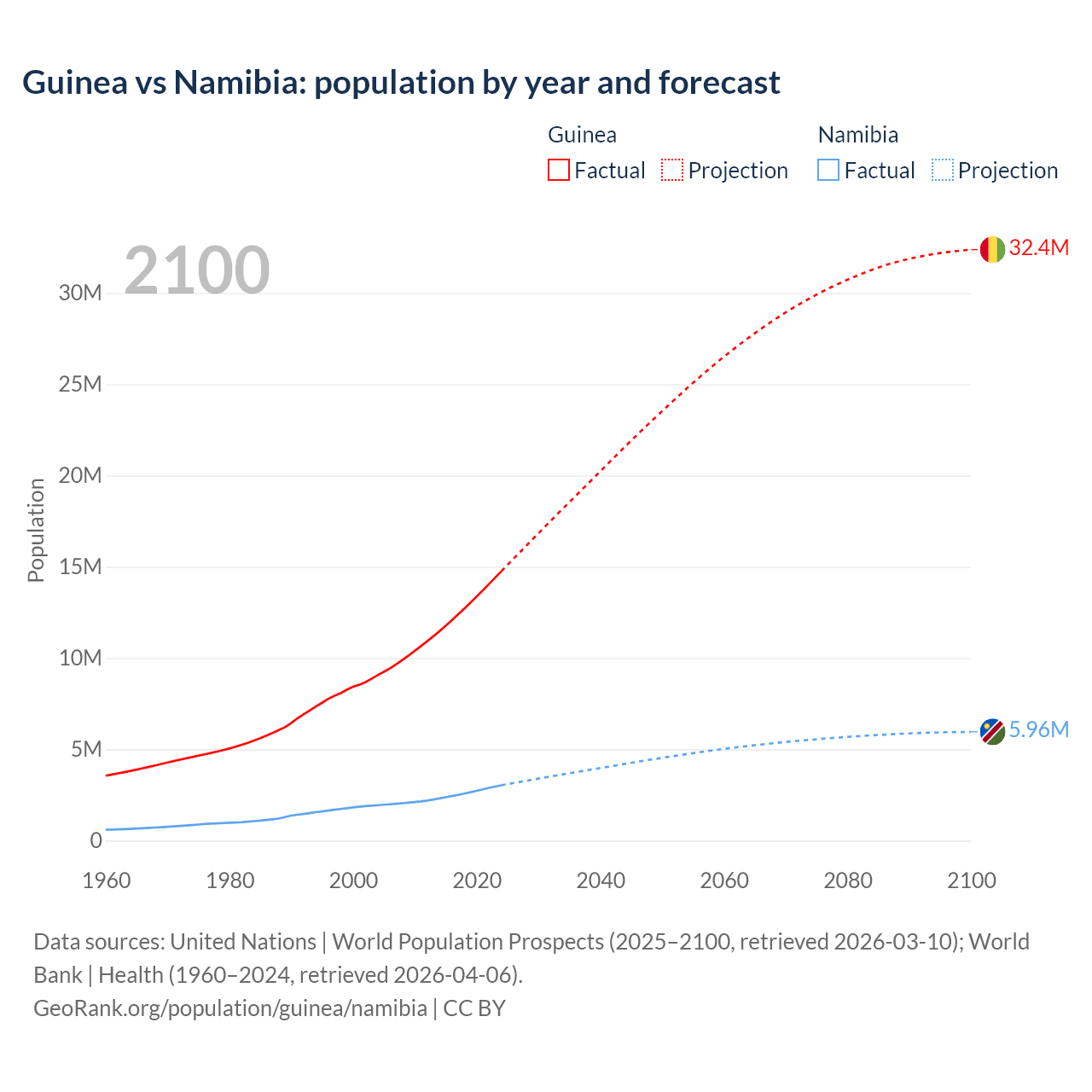The latest officially reported population of Guinea was 14,754,785 in 2024 vs 3,030,131 people in Namibia in 2024. In 2026, based on the adjusted UN estimation, the current Guinea's population is 15,546,235 people compared to 3,173,089 in Namibia.