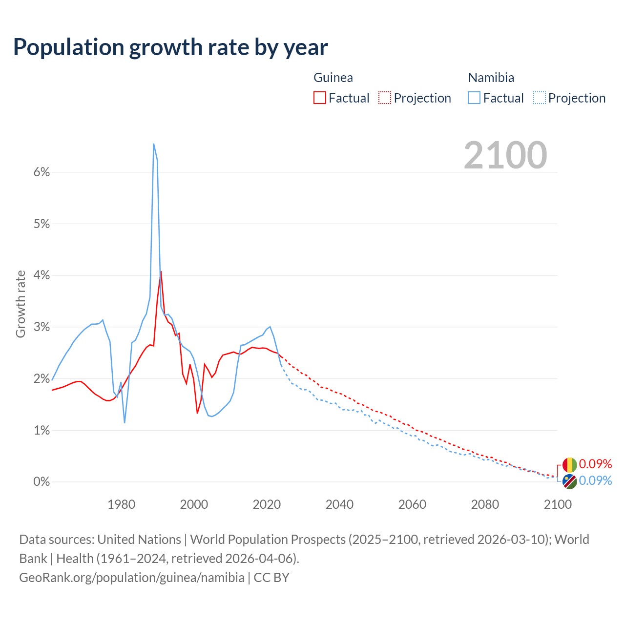 - For the last 10 years, Guinea has had an average growth rate of +2.54% per year vs +2.73% in Namibia.