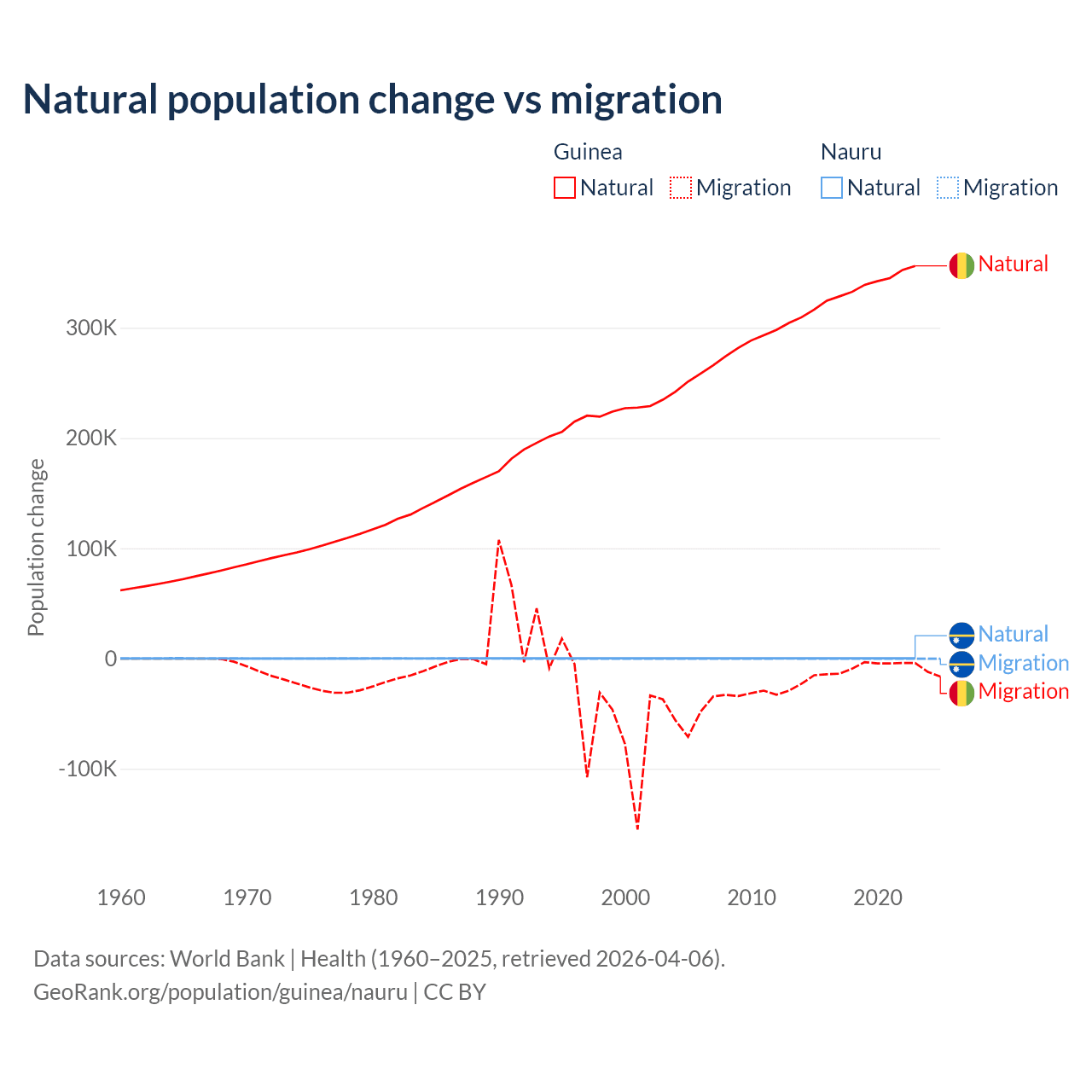 Over the last 10 years, 97.2% of the population change in Guinea is from natural causes (a gain of 3,346,936 people) and 2.76% is from migration (a loss of 94,924 people). In Nauru 66.2% is from natural causes (a gain of 2,590 people) and 33.8% is from migration (a loss of 1,320 people).