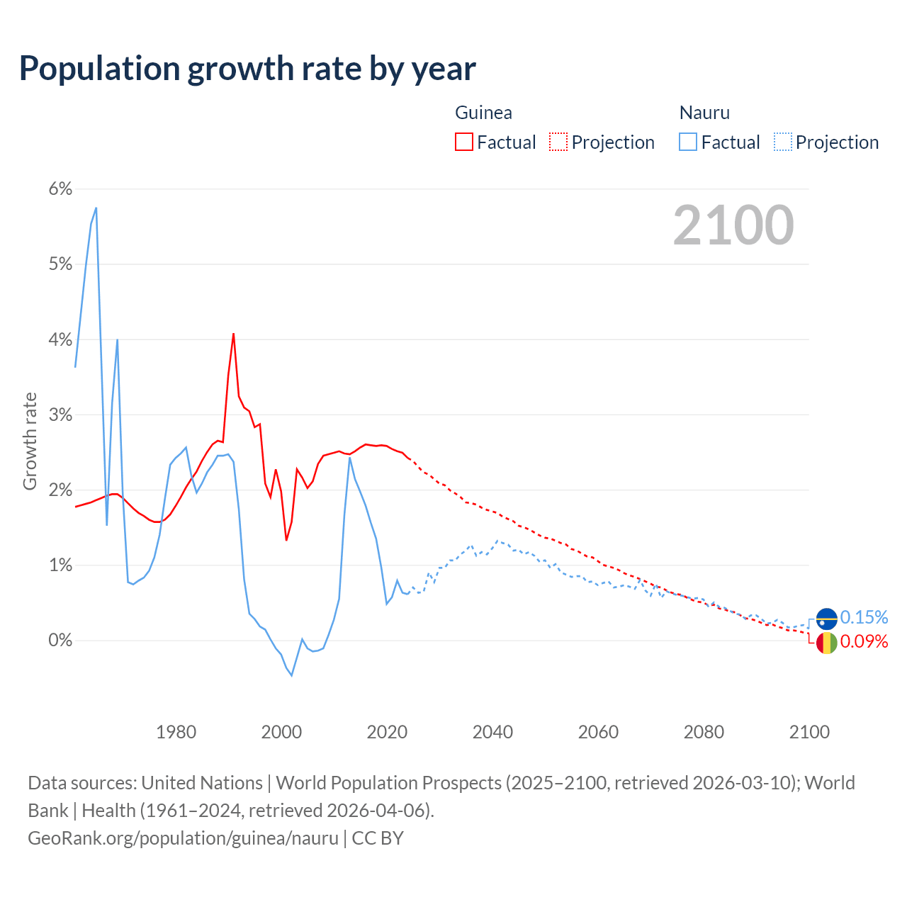 - For the last 10 years, Guinea has had an average growth rate of +2.54% per year vs +1.17% in Nauru.