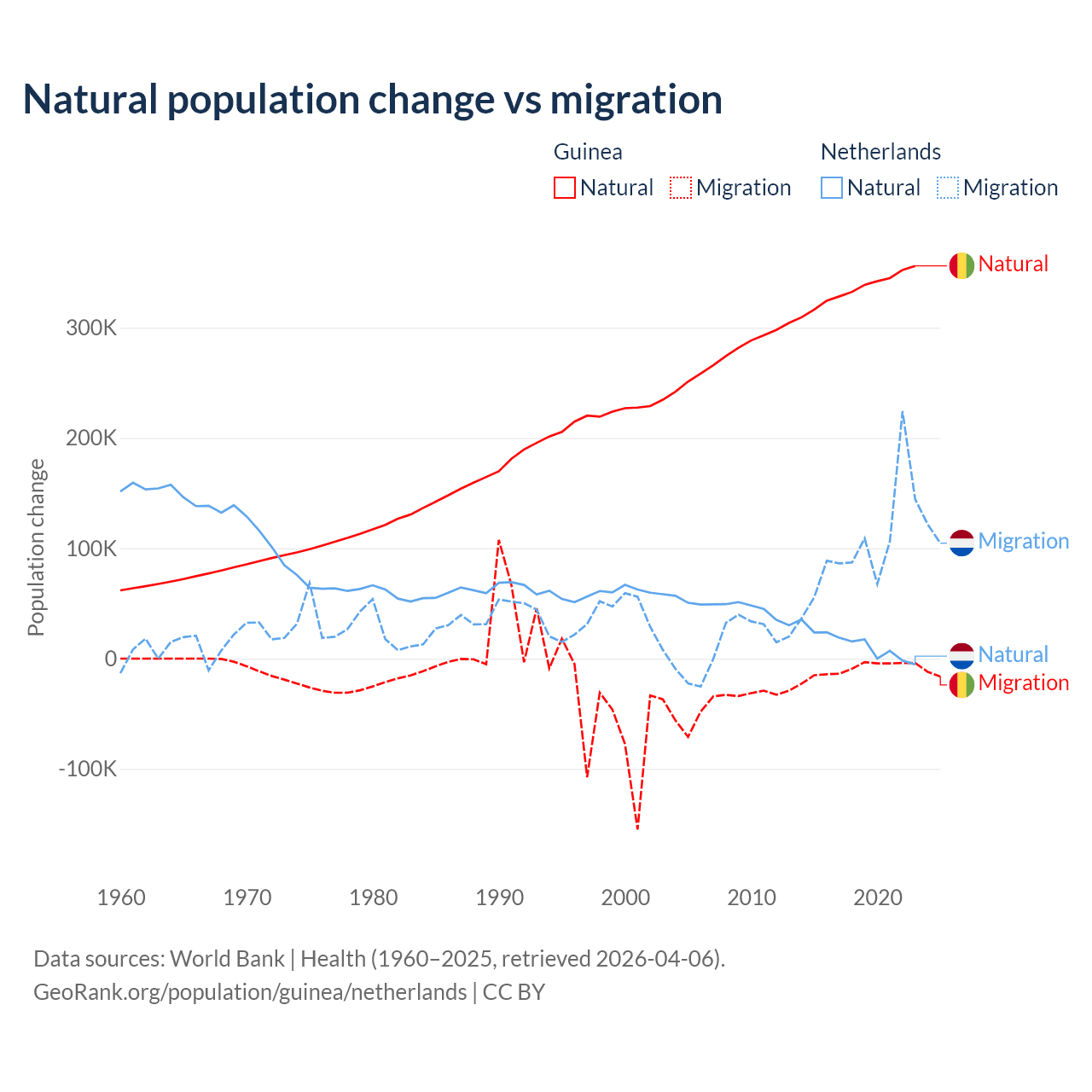 Over the last 10 years, 97.2% of the population change in Guinea is from natural causes (a gain of 3,346,936 people) and 2.76% is from migration (a loss of 94,924 people). In the Netherlands 11.8% is from natural causes (a gain of 134,554 people) and 88.2% is from migration (a gain of 1,006,495 people).