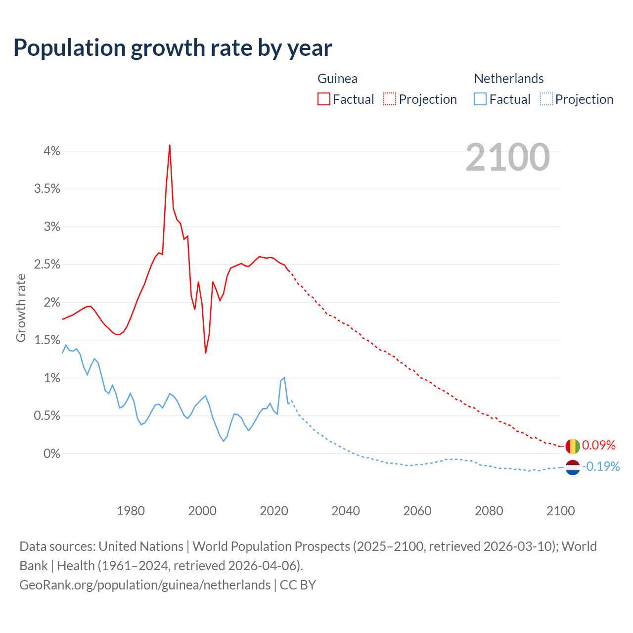 - For the last 10 years, Guinea has had an average growth rate of +2.54% per year vs +0.62% in the Netherlands.