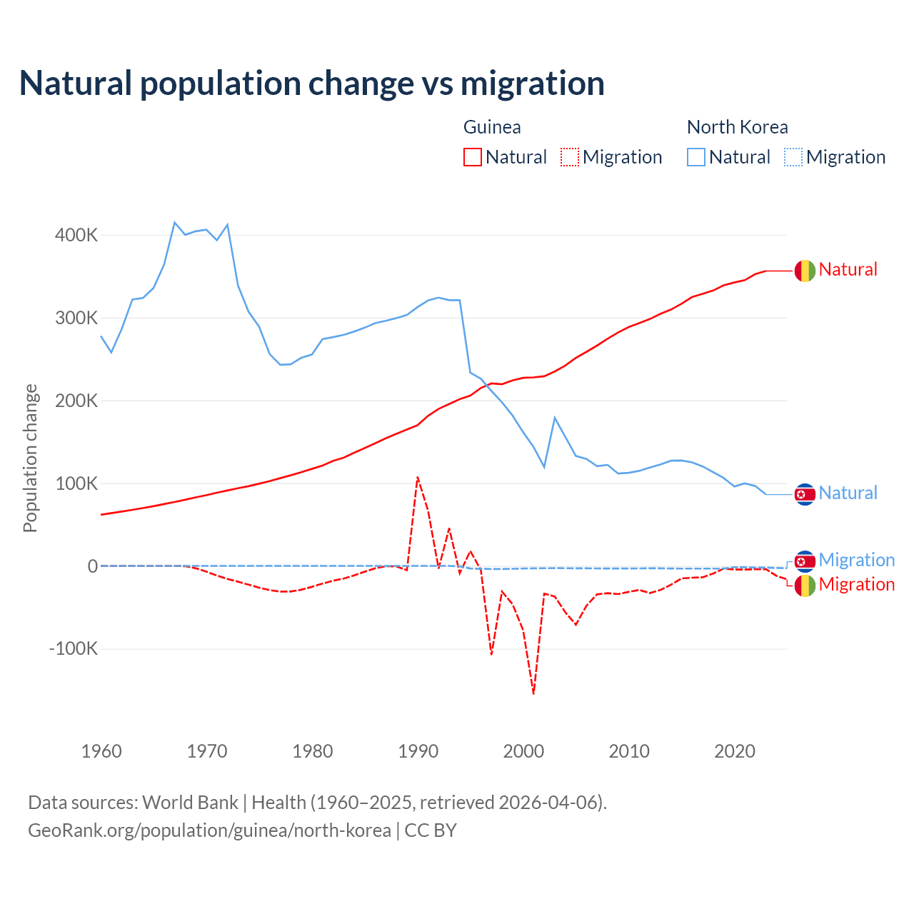 Over the last 10 years, 97.2% of the population change in Guinea is from natural causes (a gain of 3,346,936 people) and 2.76% is from migration (a loss of 94,924 people). In North Korea 97.7% is from natural causes (a gain of 1,097,372 people) and 2.33% is from migration (a loss of 26,227 people).