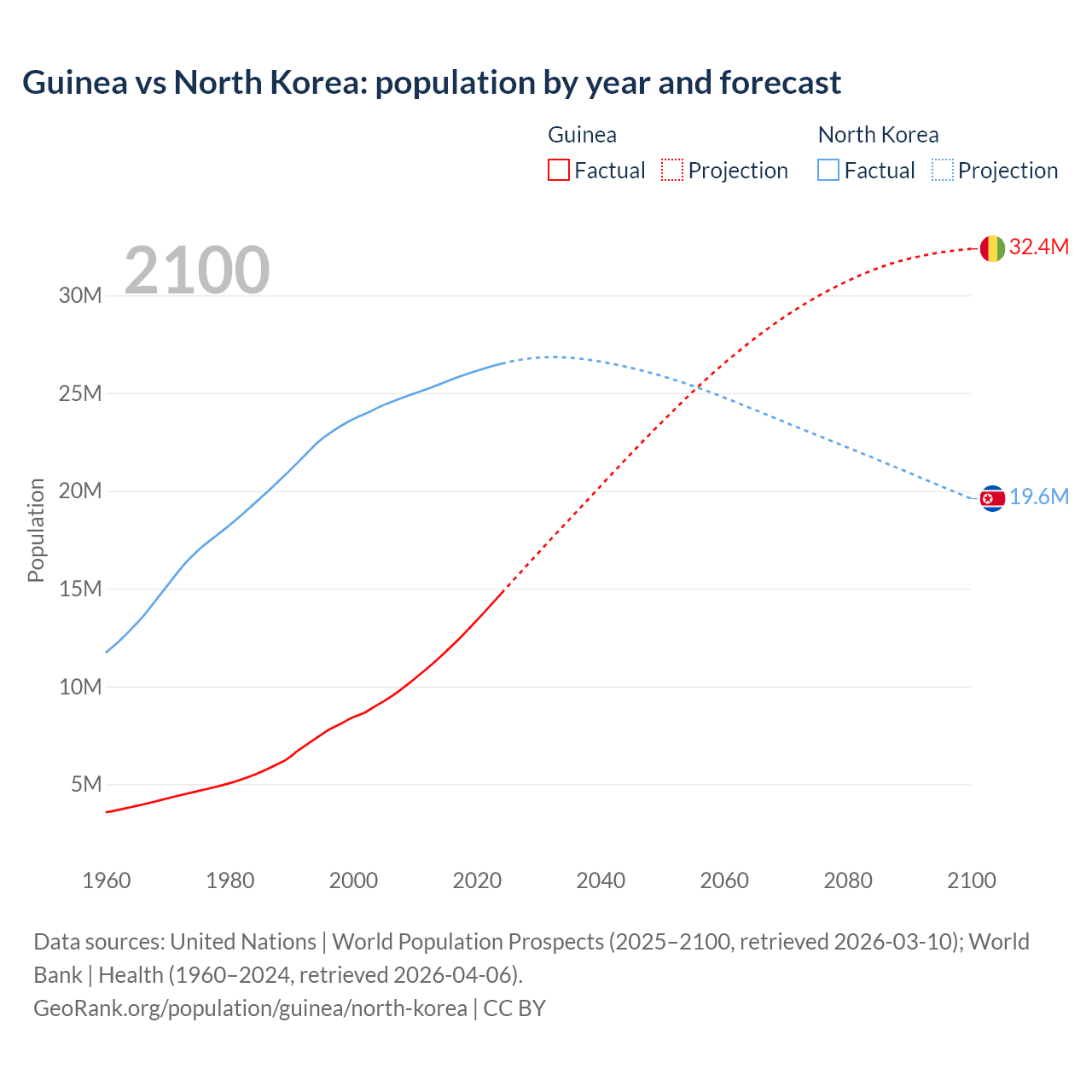 The latest officially reported population of Guinea was 14,754,785 in 2024 vs 26,498,823 people in North Korea in 2024. In 2026, based on the adjusted UN estimation, the current Guinea's population is 15,546,235 people compared to 26,659,144 in North Korea.
