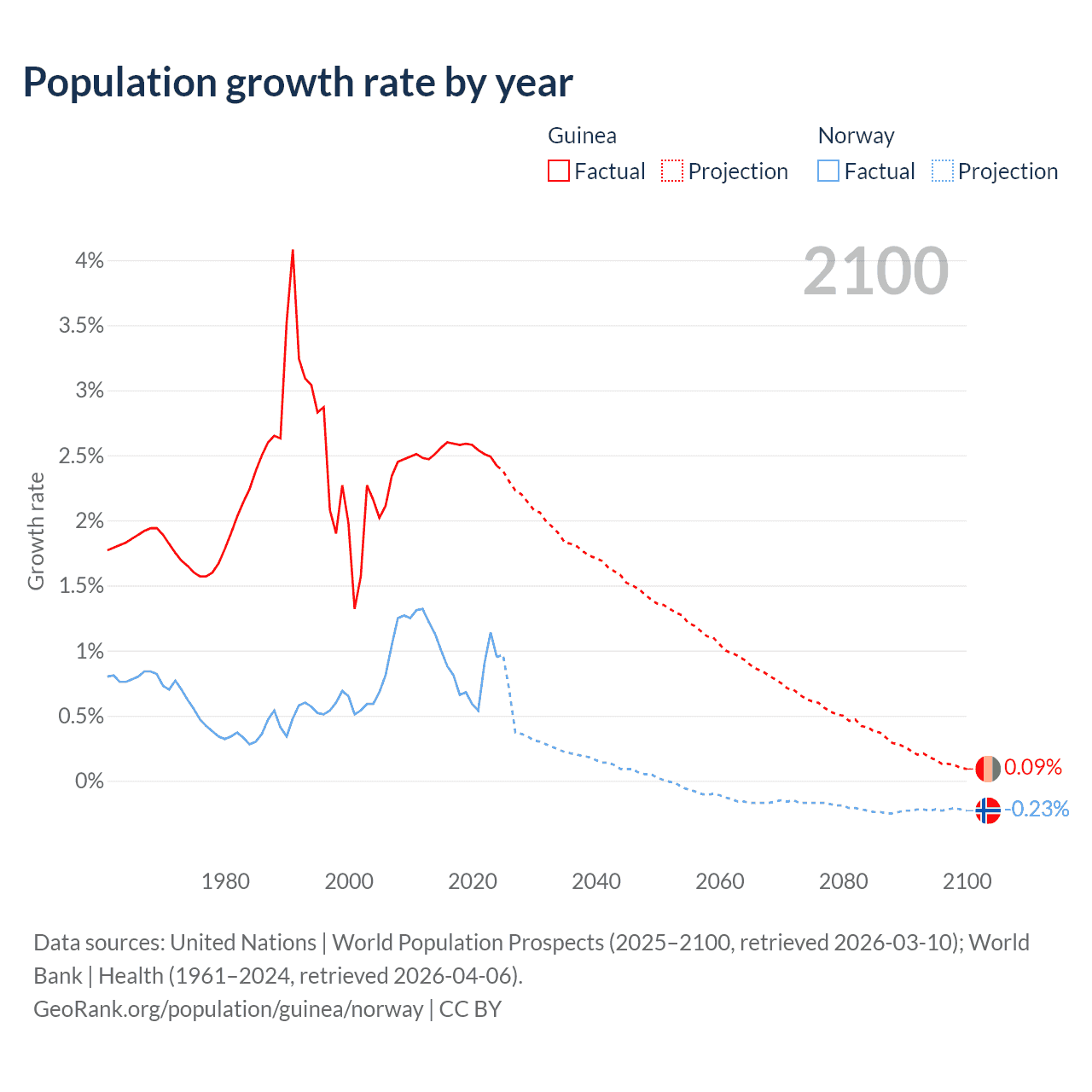 - For the last 10 years, Guinea has had an average growth rate of +2.54% per year vs +0.85% in Norway.
