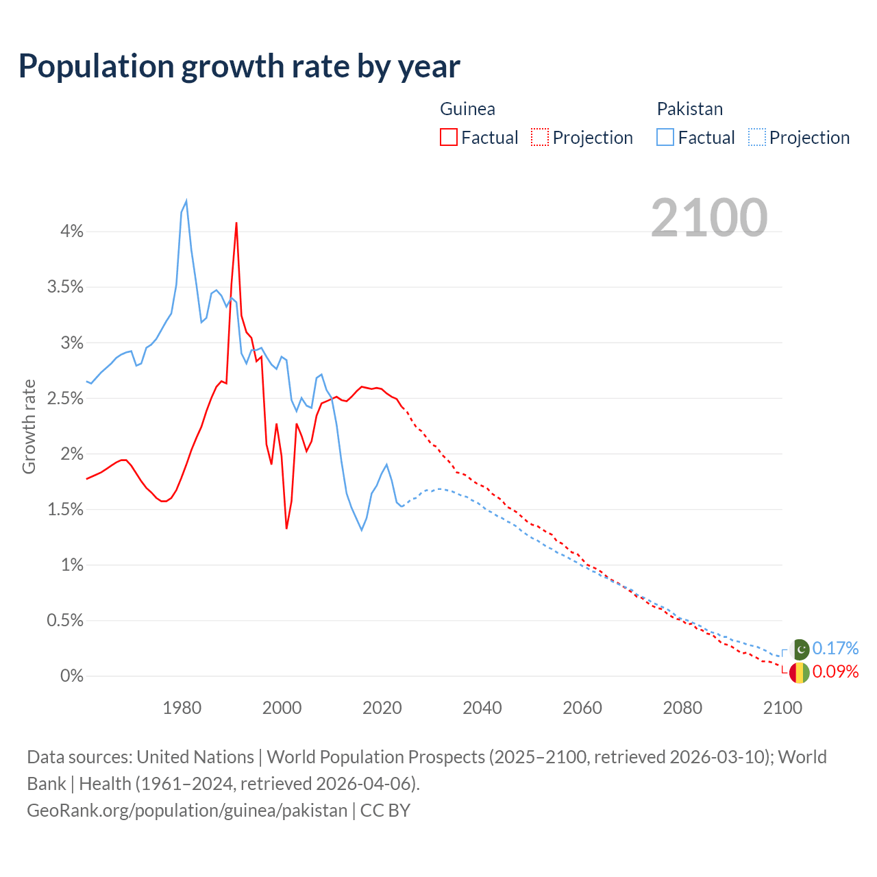 - For the last 10 years, Guinea has had an average growth rate of +2.54% per year vs +1.6% in Pakistan.
